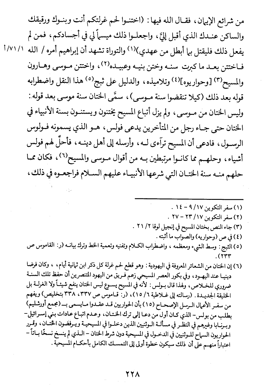من شرائع الإيمان، فقال الله فيها: "اختنوا لحم غرلتكم أنت وبنوك ورقيقك والساكن عندك الذي أقبل إليَّ، واجعلوا ذلك ميسماً لي في أجسادكم، فمن لم يفعل ذلك فليقتل بما أبطل من عهدي"1. والتوراة تشهد أن إبراهيم أمره/ (1/71/أ) الله فاختتن بعد ما كبرت سنة وختن بنيه وعبيده2، واختتن موسى وهارون والمسيح3 [وحواريوه] 4 وتلاميذه، والدليل على ثبج5 هذا النقل واضطرابه قوله بعد ذلك: "كيلا تنقضوا سنة موسى"،سمَّى الختان سنة موسى بعد قوله:"وليس الختان من موسى"، ولم يزل أتباع المسيح يختنون ويستنون بسنة الأنبياء في الختان حتى جاء رجل من المتأخرين يدعى فولس، هو الذي يسمونه فولوس الرسول، فادّعى أن المسيح ترآءى له، وأرسله إلى أهل دينه، فأحلَّ لهم فولس أشياء، وحلهم مما كانوا مرتبطين به من أقوال موسى والمسيح6، فكان مما حلهم منه سنة الختان التي شرعها الأنبياء عليهم السلام فراجعوه في ذلك،