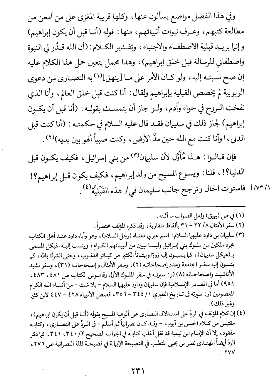 قلنا: ويسوع المسيح من ولد إبراهيم، فكيف يكون قبل إبراهيم؟! فاستوت الحال وترجح جانب سليمان في / (1/73/أ) هذه القَبْليِّة4.