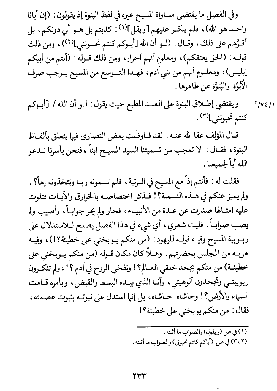 وفي الفصل ما يقتضي مساواة المسيح غيره في لفظ النبوة إذ يقولون: "إن أبانا واحد هو الله"، فلم ينكر عليهم [ويقل] 1: كذّبتم بل هو أبي دونكم، بل أقرّهم على ذلك، وقال: "لو أن الله [أبوكم كنتم تحبّونني] 2". ومن ذلك قوله: "الحقّ يعتقكم"، ومعلوم أنهم أحرار، ومن ذلك قوله: "أنتم من أبيكم إبليس"، ومعلوم أنهم من بني آدم، فهذا التوسع من المسيح يوجب صرف الأبوَّة والبُنُوَّة عن ظاهرها.