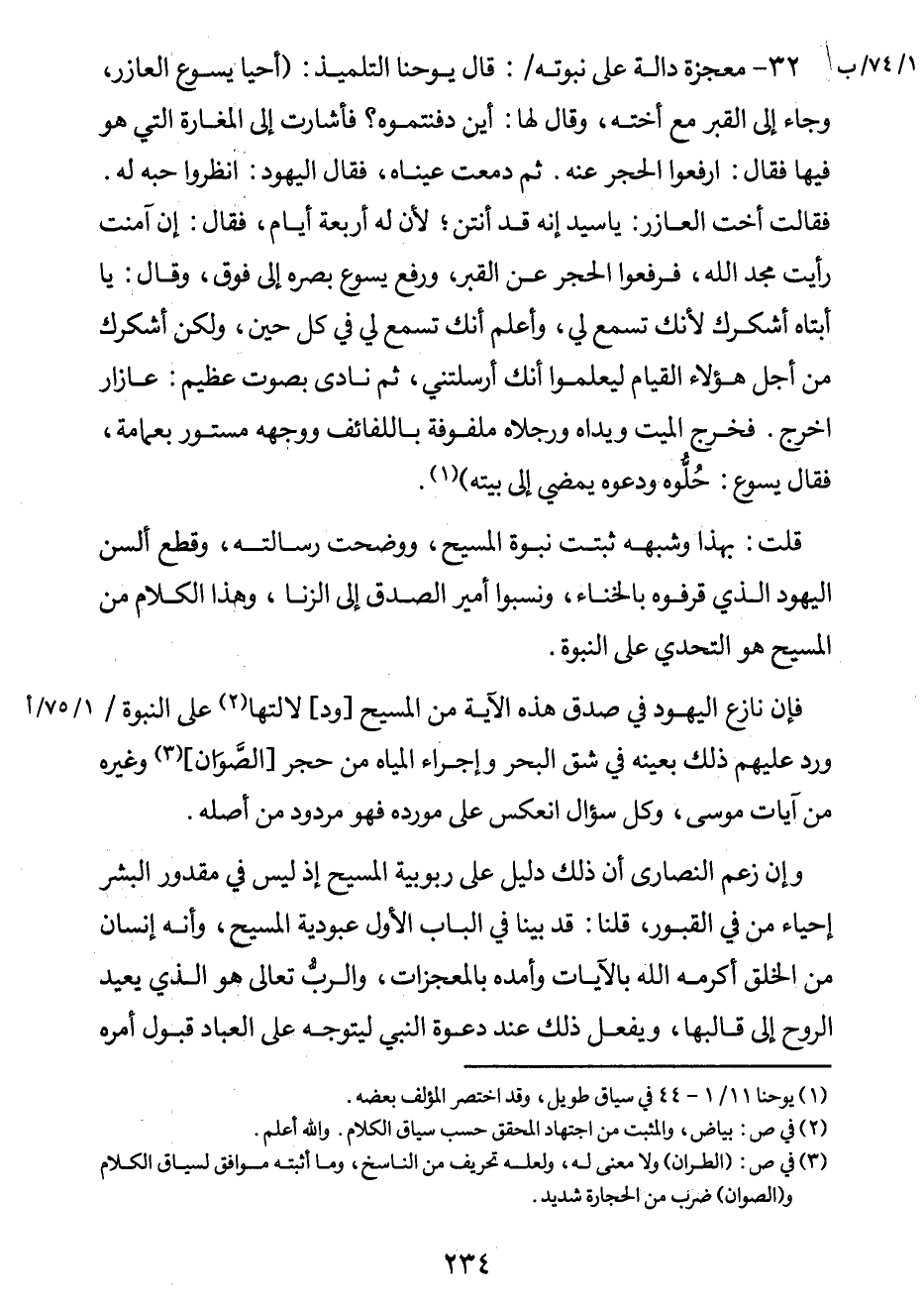 32- معجزة دالة على نبوّته / (1/74/ب) : قال يوحنا التلميذ: "أحيا يسوع العازر، وجاء إلى القبر مع أخته، وقال لها: أين دفنتموه؟ فأشارت إلى المغارة التي هو فيها، فقال: ارفعوا الحجر عنه. ثم دمعت عيناه، فقال اليهود: انظروا حبه له. فقالت أخت العازر: يا سيد إنه قد أنتن؛ لأن له أربعة أيام، فقال: إن آمنت رأيت مجد الله، فرفعوا الحجر عن القبر، ورفع يسوع بصره إلى فوق، وقال: يا أبتاه أشكرك لأنك تسمع لي، وأعلم أنك تسمع لي في كلّ حين، ولكن أشكرك من أجل هؤلاء القيام ليعلموا أنك أرسلتني، ثم نادى بصوت عظيم: عازار اخرج. فخرج الميت ويداه ورجلاه ملفوفة باللفائف ووجهه مستور بعمامة، فقال يسوع: حُلُّوه ودعوه يمضي إلى بيته"1.