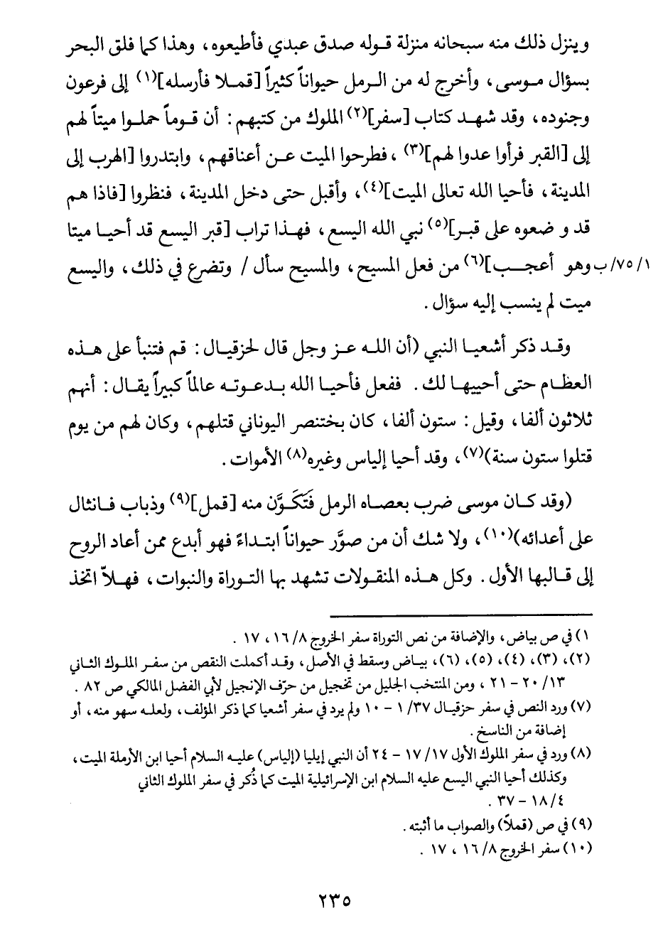 "وقد كان موسى ضرب بعصاه الرمل فَتَكَوَّنَ منه [قمل] 9 وذباب فانثال على أعدائه"10. ولا شكّ أن من صوَّر حيواناً ابتداءاً فهو أبدع ممن أعاد الروح إلى قالبها الأوّل. وكلّ هذه المنقولات تشهد بها التوراة والنبوات، فهلاّ اتّخذ