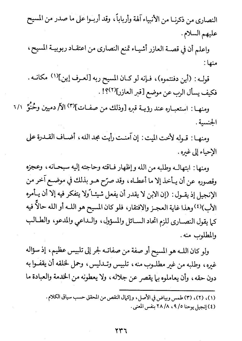 ومنها: ابتهاله وطلبه من الله وإظهار فاقته وحاجته إليه سبحانه، وعجزه وقصوره عن أن يأخذ إلاّ ما أعطاه، وقد صرّح هو بذلك في موضع آخر من الإنجيل إذ يقول: "إن الابن لا يقدر أن يفعل شيئاً ولا يتفكر فيه إلاّ أن يأمره الأب"4. وهذا غاية العجز والافتقار، فلو كان المسيح هو الله أو الله حالاً فيه كما يقول النصارى للزم اتّحاد السائل والمسؤول، والداعي والمدعو، والطالب والمطلوب منه.