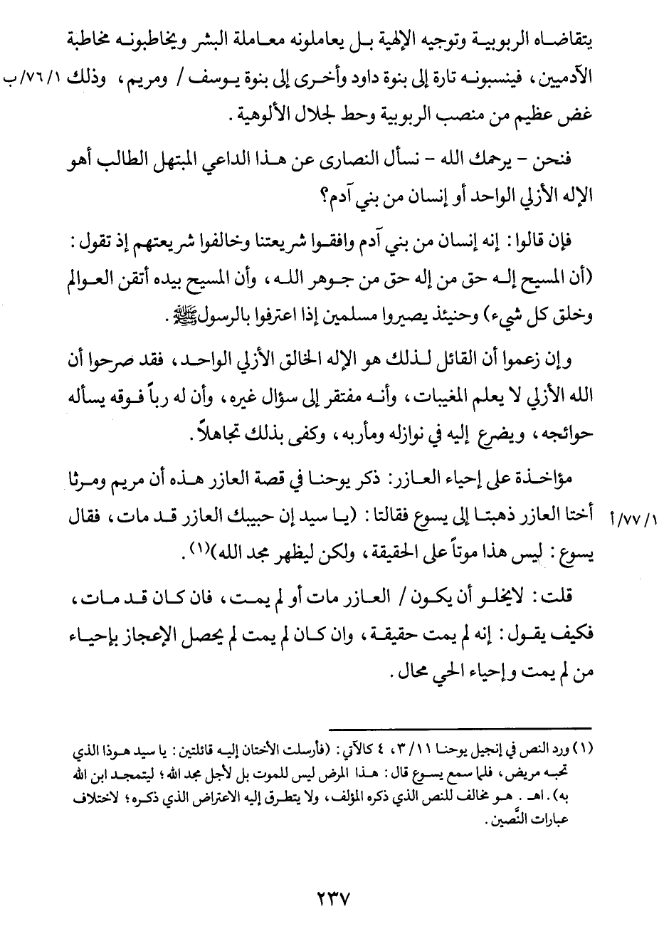 1 ورد النّصّ في إنجيل يوحنا 11/3، 4، كالآتي: "فأرسلت الأختان إليه فائلتين: يا سيد هو ذا الذي تحبه مريض، فلما سمع يسوع قال: هذا المرض ليس للموت بل لأجل مجد الله؛ ليتمجد ابن الله به". اهـ. هو مخالف للنّصّ الذي ذكره المؤلِّف، ولا يتطرق إليه الاعتراض الذي ذكره؛ لاختلاف عبارات النّصّين.