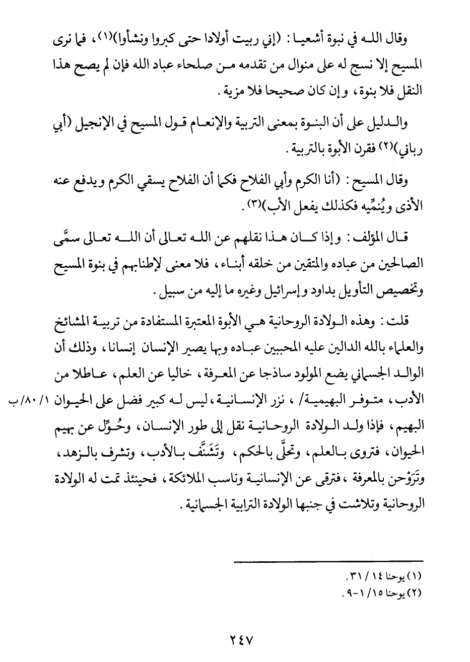 والدليل على أن البنوة بمعنى التربية والإنعام قول المسيح في الإنجيل: "إني رباني"2، فقرن الأبوة بالتربية.