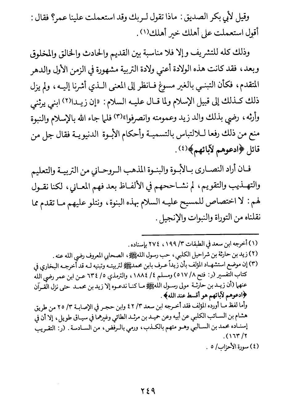 وذلك لكه للتشريف وإلاّ فلا مناسبة بين القديم والحادث والخالق والمخلوق وبعد، فقد كانت هذه الولادة - أعني ولادة التربية - مشهورة في الزمن الأوّل والدهر المتقدم، فكأن التبني بالغير مسوغ فانظر إلى المعنى الذي أشرنا إليه، ولم يزل ذلك كذلك إلى قبيل الإسلام ولما قال عزوجل: "إن زيداً2 ابني يرثني وأرثه، رضي بذلك والد زيد وعمومته وانصرفوا"3. فلما جاء الله بالإسلام والنبوة منع من ذلك رفعا للالتباس بالتسمية وأحكام الأبوة الدنيوية فقال جل من قائل: {ادْعُوهُم لآبَائِهِم} . [سورة الأحزاب، الآية: 5] .