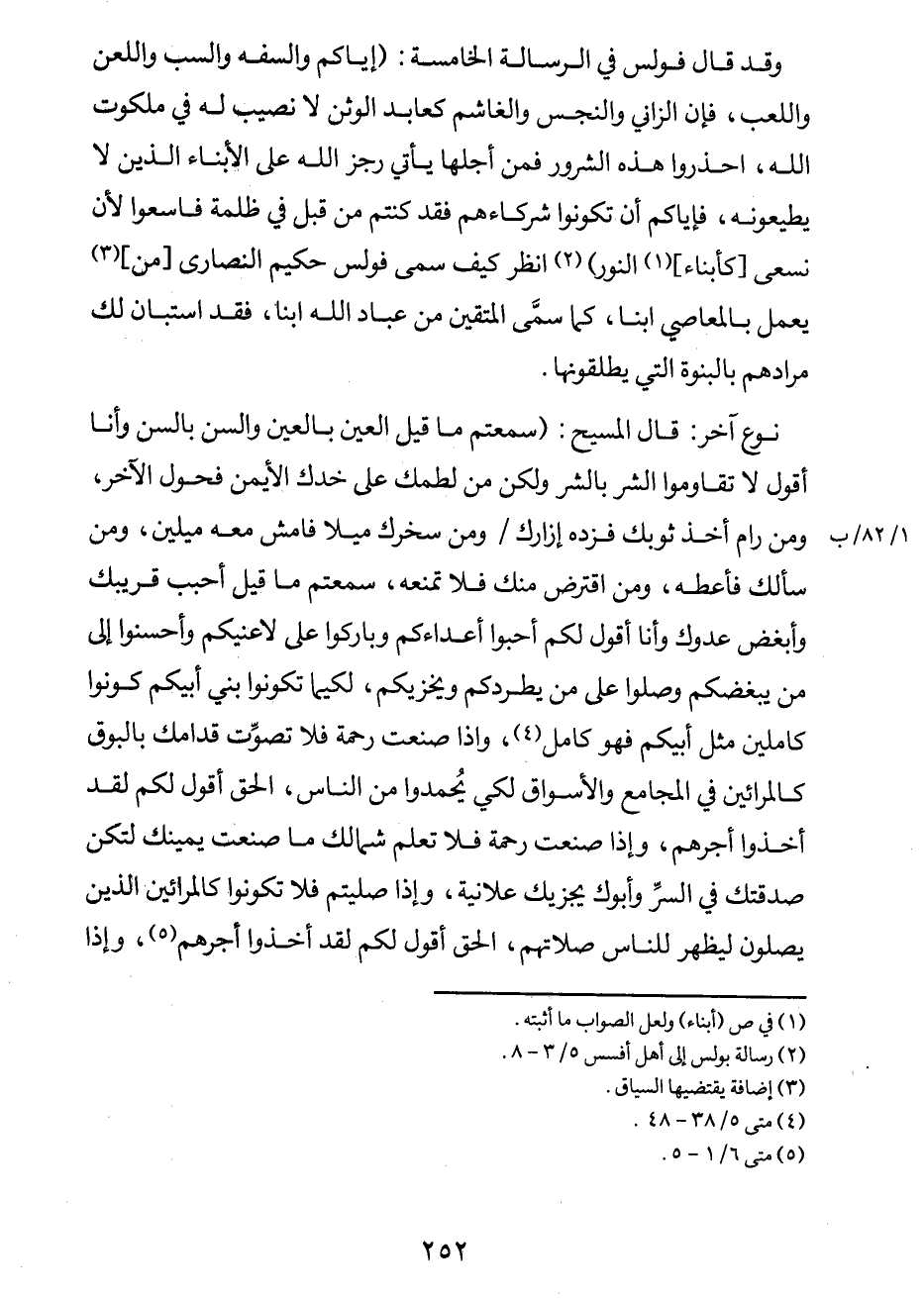 وقد قال فولس في الرسالة الخامسة: "إياكم والسفه والسب واللعن واللعب، فإن الزاني والنجس والغاشم كعابد الوثن لا نصيب له في ملكوت الله، احذروا هذه الشرور فمن أجلها يأتي رجز الله على الأبناء الذين لا يطيعونه، فإياكم أن تكونوا شركاءهم فقد كنتم من قبل في ظلمة فاسعوا لأن نسعى [كأبناء] 1 النور"2. انظر كيف سمى فولس حكيم النصارى [من] 3 يعمل بالمعاصي ابناً، كما سمّى المتقين من عباد الله ابناً، فقد استبان لك مرادهم بالبنوة التي يطلقونها.