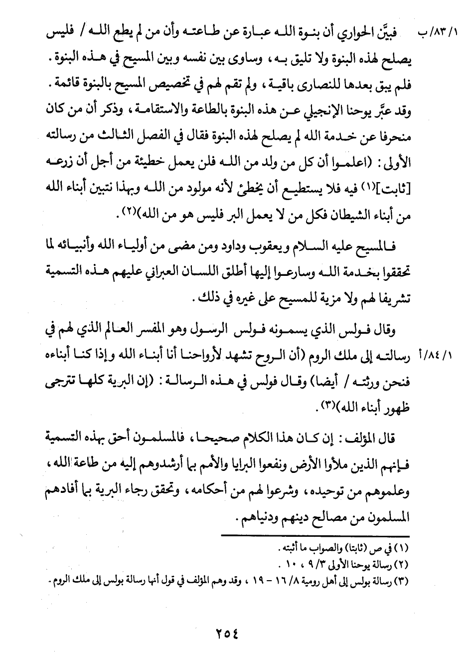 فبيَّن الحواري أن بنوة الله عبارة عن طاعته وأن من لم يطع الله / (1/83/ب) فليس يصلح لهذه البنوة ولا تليق به، وساوى بين نفسه وبين المسيح في هذه البنوة. فلم يبق بعدها للنصارى باقية، ولم تقم لهم في تخصيص المسيح بالبنوة قائمة. وقد عبَّر يوحنا الإنجيلي عن هذه البنوة بالطاعة والاستقامة، وذكر أن مَن كان منحرفاً عن خدمة الله لم يصلح لهذه البنوة، فقال في الفصل الثالث من رسالته الأولى: "اعملوا أن كل من ولد من الله فلن يعمل خطيئة من أجل أن زرعه [ثابت] 1 فيه فلا يستطيع أن يخطئ لأنه مولود من الله وبهذا نتبيّن أبناء الله من أبناء الشيطان فكل من لا يعمل البر فليس هو من الله"2.