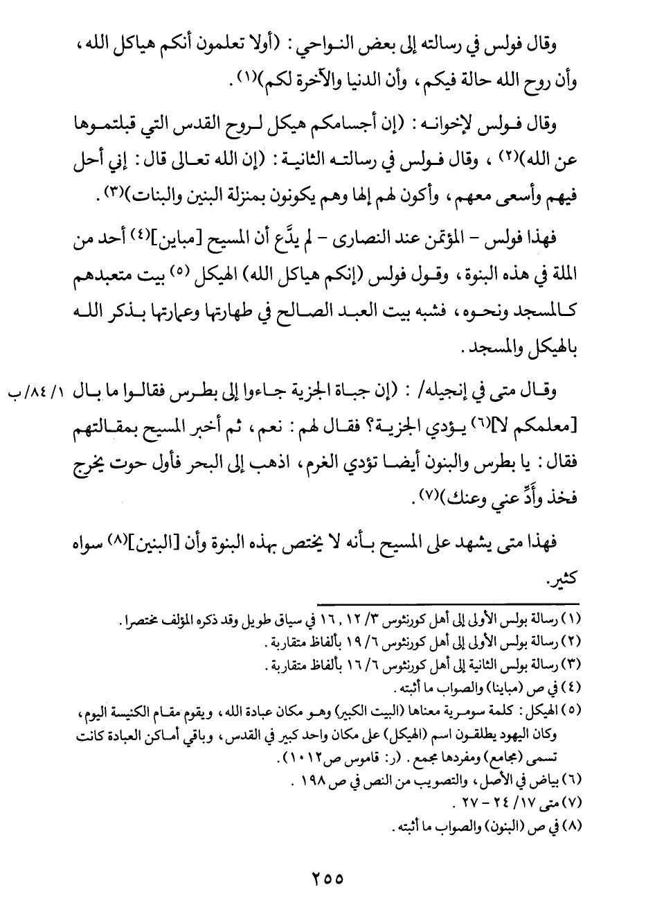 فهذا فولس- المؤتمن عند النصارى-لم يدَّع أن المسيح [مباين] 4 أحد من الملة في هذه البنوة، وقول فولس: "إنكم هياكل الله"، الهيكل5 بيت متعبدهم كالمسجد ونحوه، فشبه بيت العبد الصالح في طهارتها وعمارتها بذكر الله بالهيكل والمسجد.