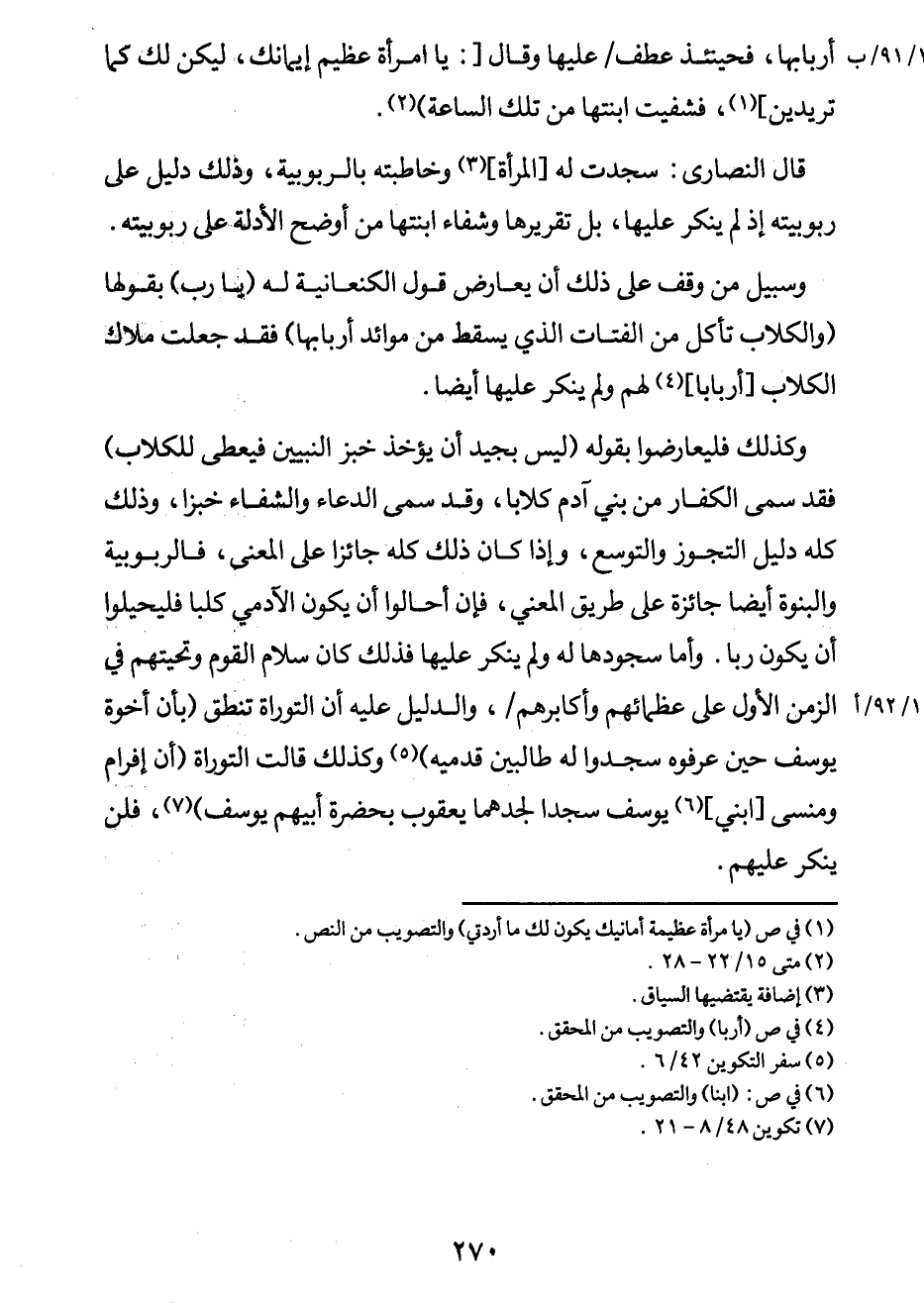 وسبيل من وقف على ذلك أن يعارض قول الكنعانية له: "يا رب"، بقولها: "والكلاب تأكل من الفتات الذي يسقط من موائد أربابها"، فقد جعلت ملاك الكلاب [أرباباً] 4 لهم ولم ينكر عليها أيضاً.