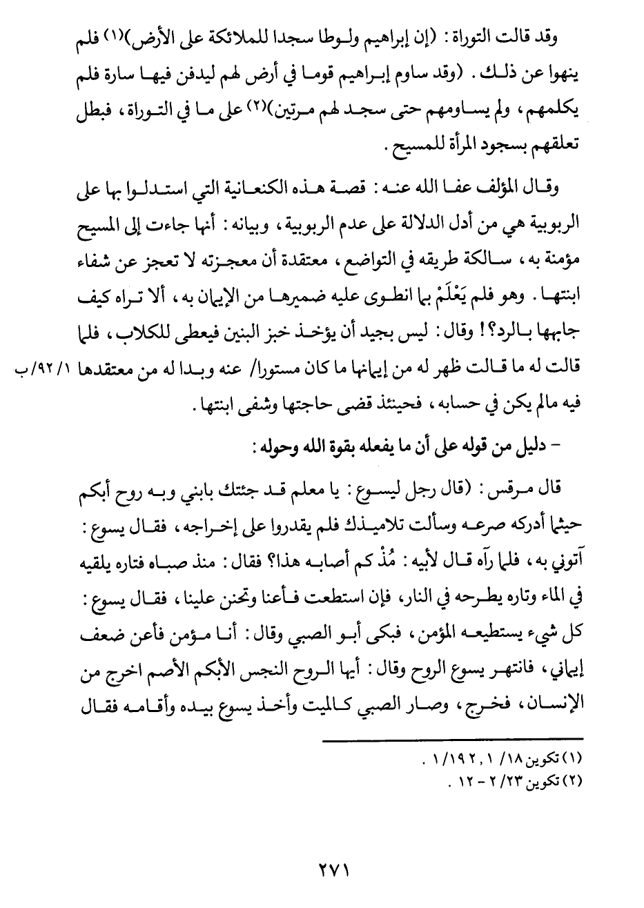 وقد قالت التوراة: "إن إبراهيم ولوطاً سجدا للملائكة على الأرض"1، فلم ينهوا عن ذلك. "وقد ساوم إبراهيم قوماً في أرض لهم ليدفن سارة فلم يكلّمهم، ولم يساومهم حتى سجد لهم مرتّين"2. على ما في التوراة، فبطل تعلقهم بسجود المرأة للمسيح.