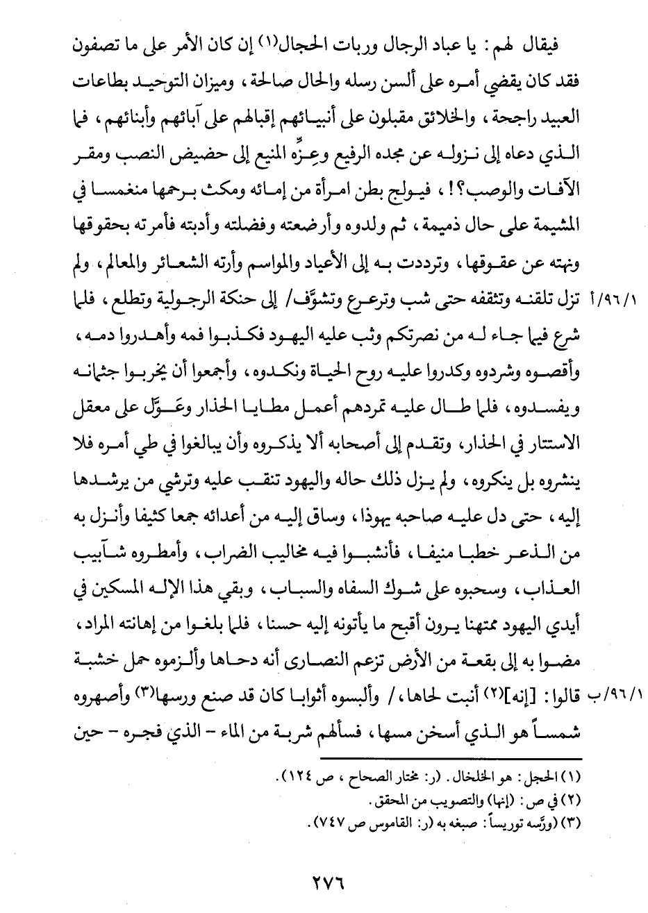 فيقال لهم: يا عباد الرجال وربات الحجال1 إن كان الأمر على ما تصفون فقد كان يقضي أمره على ألسن رسله والحال صالحة، وميزان التوحيد بطاعات العبيد راجحة، والخلائق مقبلون على أنبيائهم إقبالهم على آبائهم وأبنائهم، فما الذي دعاه إلى نزوله عن مجده الرفيع وعِزَّه المنيع إلى حضيض النصب ومقر الآفات والوصب؟! فيولج بطن امرأة من إمائه ومكث برحمها منغمساً في المشيمة على حال ذميمة، ثم ولدوه وأرضعته وفضلته وأدبته فأمرته بحقوقها ونهته عن عقوقها، وترددت به إلى الأعياد والمواسم وأرته الشعائر والمعالم، ولم تزل تلقنه وتثقفه حتى شبّ وترعرع وتشوَّف / (1/96/أ) إلى حنكة الرجولية وتطلع، فلما شرع فيما جاء له من نصرتكم وثب عليه اليهود فكذبوا فمه وأهدروا دمه، وأقصوه وشردوه وكدروا عليه روح الحياة ونكدوه، وأجمعوا أن يخربوا جثمانه ويفسدوه، فلما طال عليه تمردهم أعمل مطايا الحذار وعَوَّل على معقل الاستتار في الحذار، وتقدم إلى أصحابه ألا يذكروه وأن يبالغوا في طي أمره فلا ينشروه بل ينكروه، ولم يزل ذلك حاله واليهود تنقب عليه وترشي من يرشدها إليه، حتى دلّ عليه صاحبه يهوذا، وساق إليه من أعدائه جمعاً كثيفاً وأنزل به من الذعر خطباً منيفاً. فأنشبوا فيه مخاليب الضراب، وأمطروه شآبيب العذاب، وسحبوه على شوك السفاه والسباب، وبقي هذا الإله المسكين في أيدي اليهود ممتهناً يرون أقبح ما يأتونه إليه حسناً، فلما بلغوا من إهانته المراد، مضوا به إلى بقعة من الأرض تزعم النصارى أنه دحاها وألزموه حمل خشبة قالوا: [إنه] 2 أنبت لحاها، / (1/96/ب) وألبسوه أثواباً كان قد صنع ورسها3 وأصهوره شمساً هو الذي أسخن مسها، فسألهم شربة من الماء - الذي فجره - حين