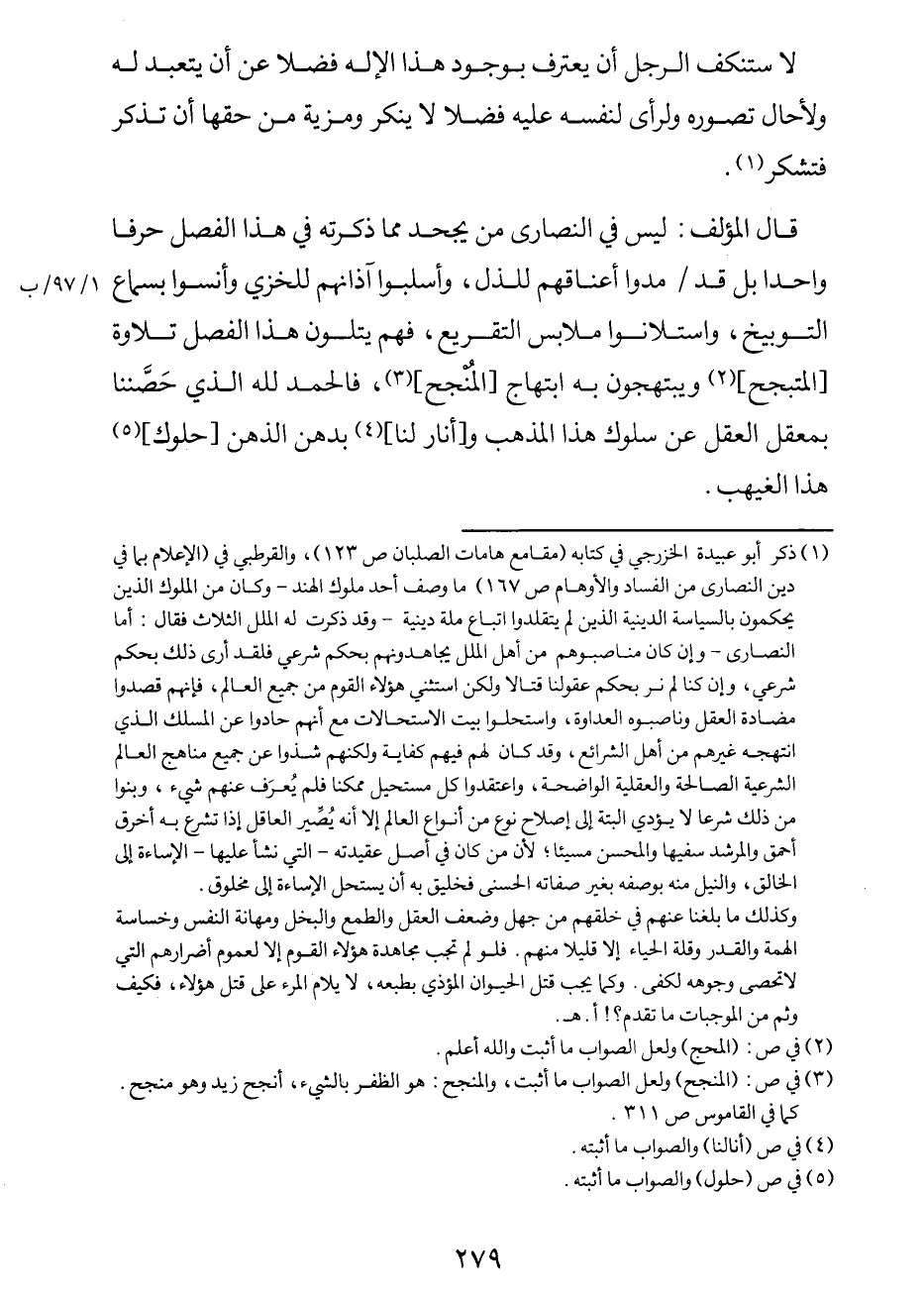 1 ذكر أبو عبيدة الخزرجي في كتابه: (مقامع هامات الصلبان ص 123) ، والقرطبي في: (الإعلام بما في دين النصارى من الفساد والأوهام ص 167) ، ما وصف أحد ملوك الهند-وكان من الملوك الذين يحكمون بالسياسة الدينية الذين لم يتقلدوا أتباع ملة دينية-وقد ذكرت له الملل الثلاث فقال: أما النصارى-وإن كان مناصبوهم من أهل الملل يجاهدونهم بحكم شرعي فلقد أرى ذلك بحكم شرعي، وإن كنا لم نر بحكم عقولنا قتالاً ولكن استثني هؤلاء القوم من جميع العالم، فإنهم قصدوا مضادة العقل وناصبوه العداوة، واستحلوا بيت الاستحالات مع أنهم حادوا عن المسلك الذي انتهجه غيرهم من أهل الشرائع، وقد كان لهم فيهم كفاية ولكنهم شذوا عن جميع مناهج العالم الشرعية الصالحة والعقلية الواضحة، واعتقدوا كلّ مستحيل ممكناً فلم يُعرَف عنهم شيء، وبنوا من ذلك شرعاً لا يؤدي البتة إلى صلاح نوع من أنواع العلام إلاّ أنه يُصيِّر العاقل إذا تشرع به أخرق أحق والمرشد سفيهاً والمحسن مسيئاً؛ لأن من كان في أصل عقيدته-التي نشأ عليها-الإساءة إلى الخالق، والنيل منه بوصفه بغير صفاته الحسنى فخليق به أن يستحل الإساءة إلى مخلوق.