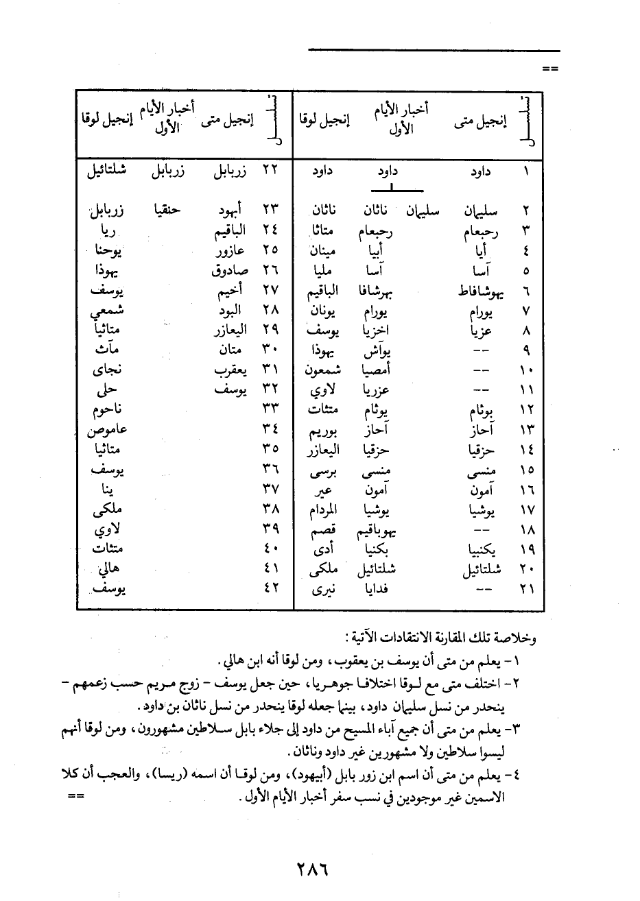 3- يعلم من متى أن جميع آباء المسيح من داود إلى جلاء بابل سلاطين مشهورون، ومن لوقا أنهم ليسوا سلاطين ولا مشهورين غير داود وناثان.