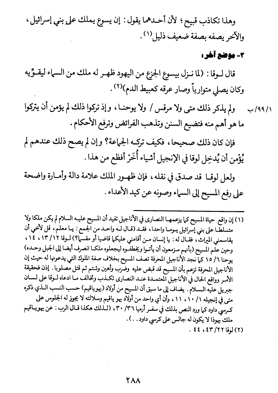 ولم يذكر ذلك متى ولا مرقس / (1/99/ب) ولا يوحنا، وإذ تركوا ذلك لم يؤمن أن يتركوا ما هو أهمّ منه فتضيع السنن وتذهب الفرائض وترفع الأحكام.