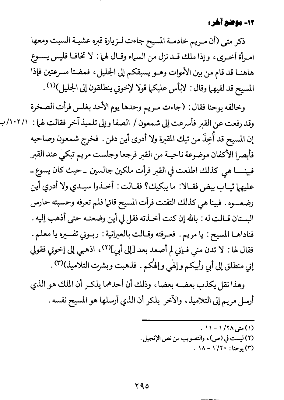وخالفه يوحنا فقال: "جاءت مريم وحدها يوم الأحد بغلس فرأت الصخرة وقد رفعت عن القبر فأسرعت إلى شمعون م (1/102/ب) الصفا وإلى تلميذ آخر فقالت لهما: إن المسيح قد أُخِذَ من تيك المقبرة ولا أدري أين دفن. فخرج شمعون وصاحبه فأبصر الأكفان موضوعة ناحية من القبر فرجعا وجلست مريم تبكي عند القبر فبينا هي كذلك اطلعت في القبر فرأت ملكين جالسين - حيث كان يسوع - عليهما ثياب بيض فقالا: ما يبكيك؟ فقالت: أخذوا سيدي ولا أدري أين وضعوه. فبينا هي كذلك التفتت فرأت المسيح قائماً فلم تعرف وحسبته حارس البستان قالت له: بالله إن كنت أخذته فقل لي أين وضعته حتى أذهب إليه. فناداها المسيح: يا مريم. فعرفته، وقالت: بالعبرانية: ربوني تفسيره يا معلم. فقال لها: لا تدن مني فإني لم أصعد بعد [إلى أبي] 2، اذهبي إلى إخوتي فقولي إني منطلق إلى أبي وأبيكم وإلهي وإلهكم. فذهبت وبشرت التلاميذ"3.