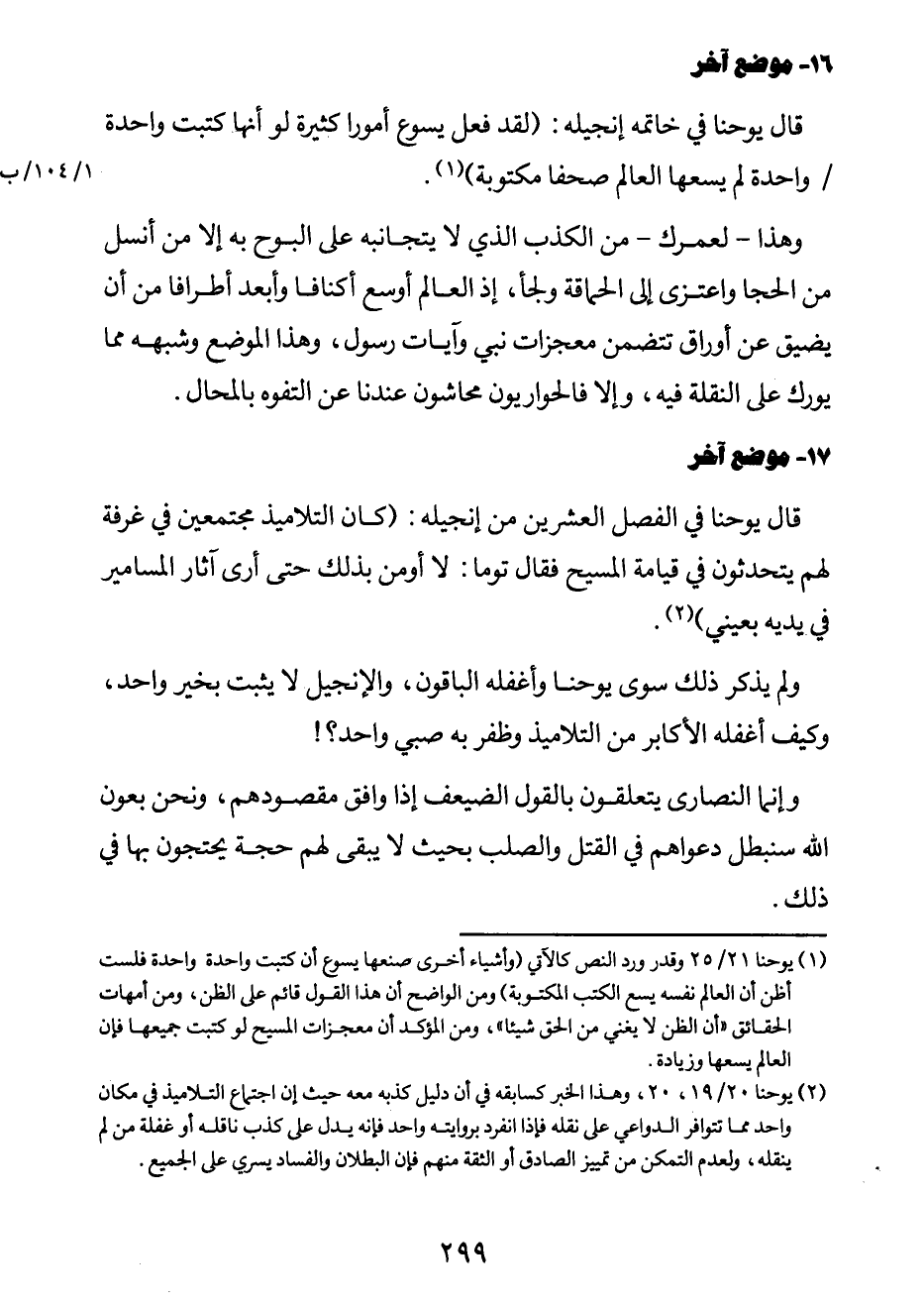 1 يوحنا 21/25، وقد ورد النّصّ كالآتي: "وأشياء أخرى صنعها يسوع أن كتبت واحدة واحدة فلست أظن أن العالم نفسه يسع الكتب المكتوبة". ومن الواضح أن هذا القول قائم على الظن، ومن أمهات الحقائق: "أن الظن لا يغني من الحقّ شيئاً"، ومن المؤكّد أن معجزات المسيح لو كتبت جميعها فإن العالم يسعها وزيادة.