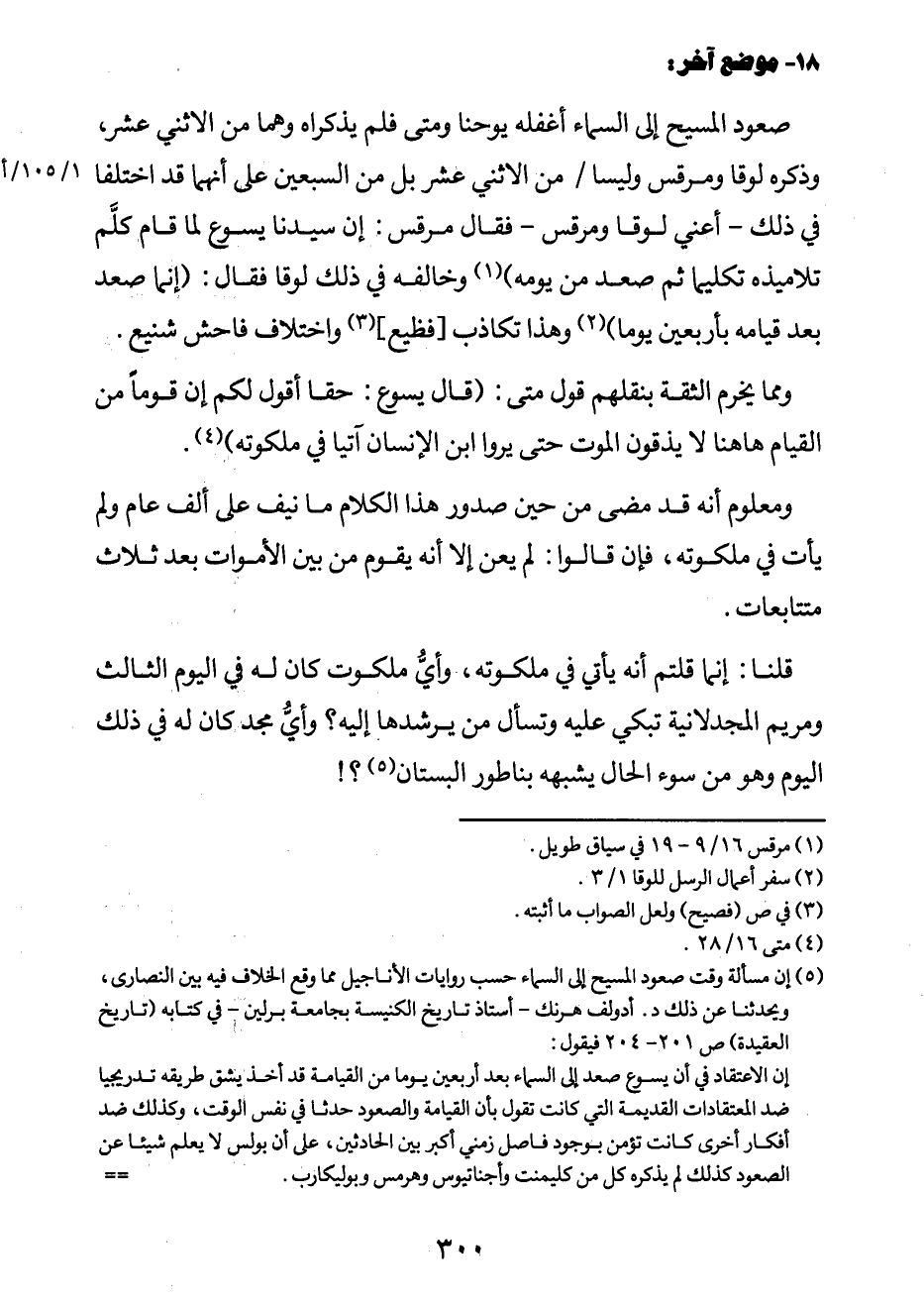 ثم يقول: "وقد قالت بعض الطوائف والمصادر المسيحية أن الصعود إلى السماء حدث بعد ثمانية عشرشهراً من القيامة، وقال أخرى: حدث بعدأحدعشرعاماً". اهـ.