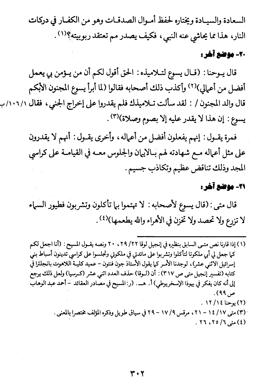 قال يوحنا: "قال يسوع لتلاميذه: الحقّ أقول لكم أن من يؤمن بيَ يعمل أفضل من أعمالي"2. وأكذب ذلك أصحابه فقالوا: "لما أبرأ يسوع المجنون الأبكم قال والد المجنون / (1/106/أ) لقد سألت تلاميذك فلم يقدروا على إخراج الجني، فقال يسوع: إن هذا لا يقدر عليه إلاّ بصوم وصلاة"3.