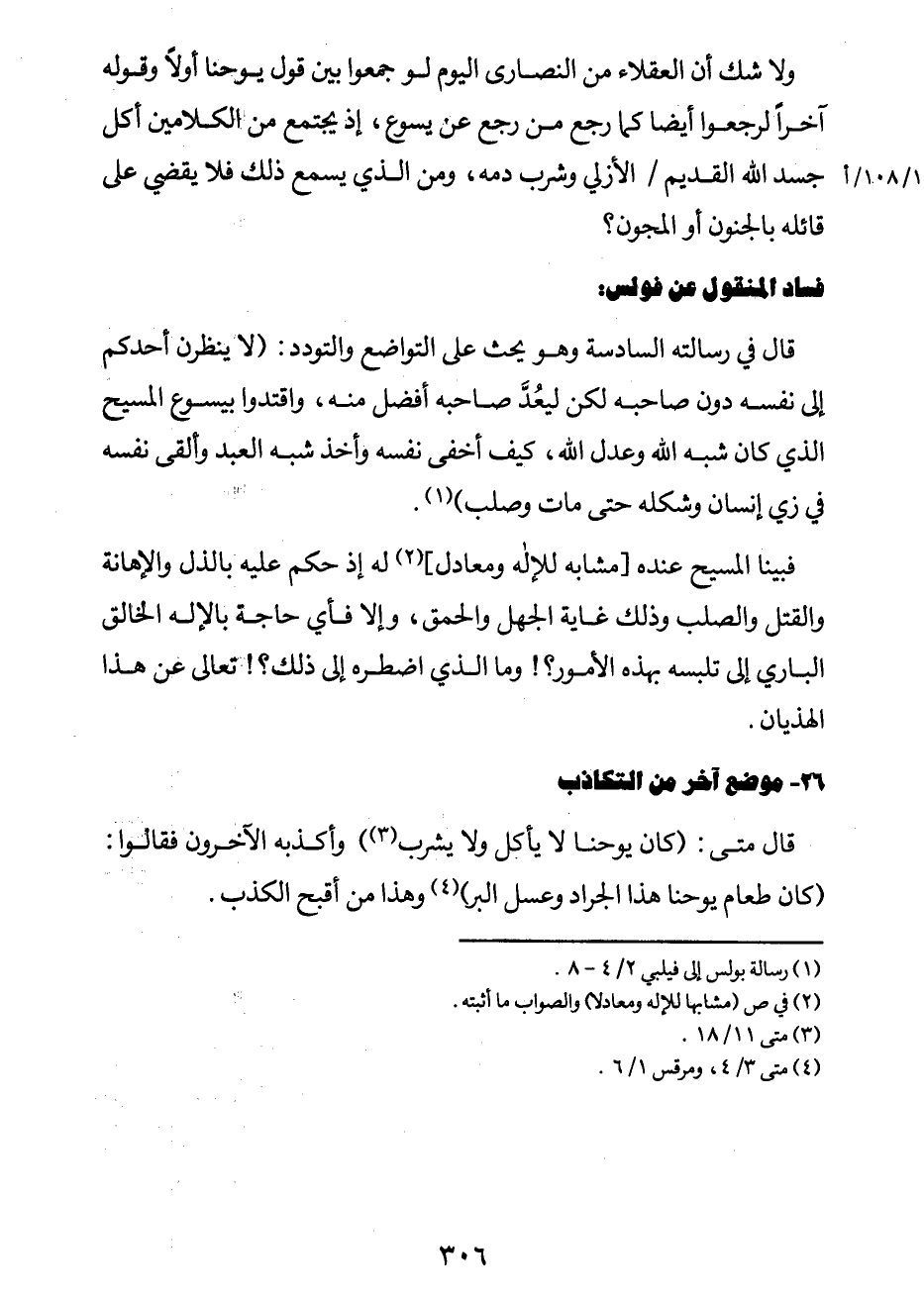 فبينا المسيح عنده [مشابه للإله ومعادل] 2 له إذ حكم عليه بالذلّ والإهانة والقتل والصلب وذلك غاية الجهل والحمق، وإلاّ فأي حاجة بالإله الخالق الباري إلى تلبسه بهذه الأمور؟! وما الذي اضطره إلى ذلك؟! تعالى عن هذا الهذيان.
