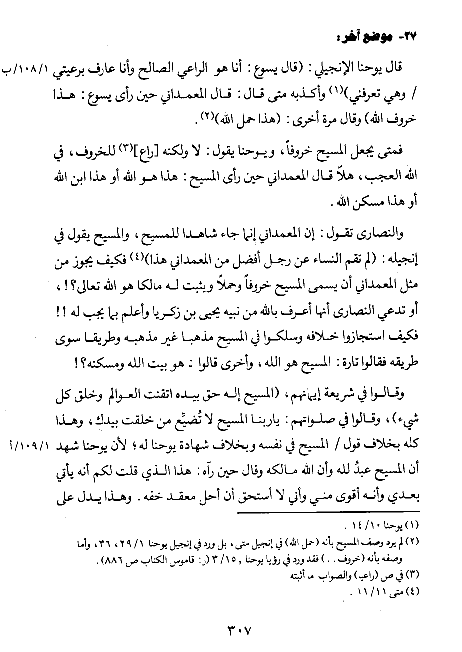 فمتى يجعل المسيح خروفاً، ويوحنا يقول: لا ولكنه [راعٍ] 3 للخروف، في الله العجب، هلاّ قال المعمداني حين رأى المسيح: هذا هو الله أو هذا ابن الله أو هذا مسكن الله.