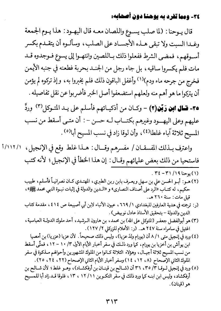 وكان من أذكيائهم فأسلم على يدي المتوكِّل3 وردَّ عليهم وعلى اليهود وغيرهم بكتابٍ له حسن -: "إن متى أسقط من نسب المسيح ثلاثة آباء غلطاً4، وأن لوقا زاد في نسب المسيح أباً"5.