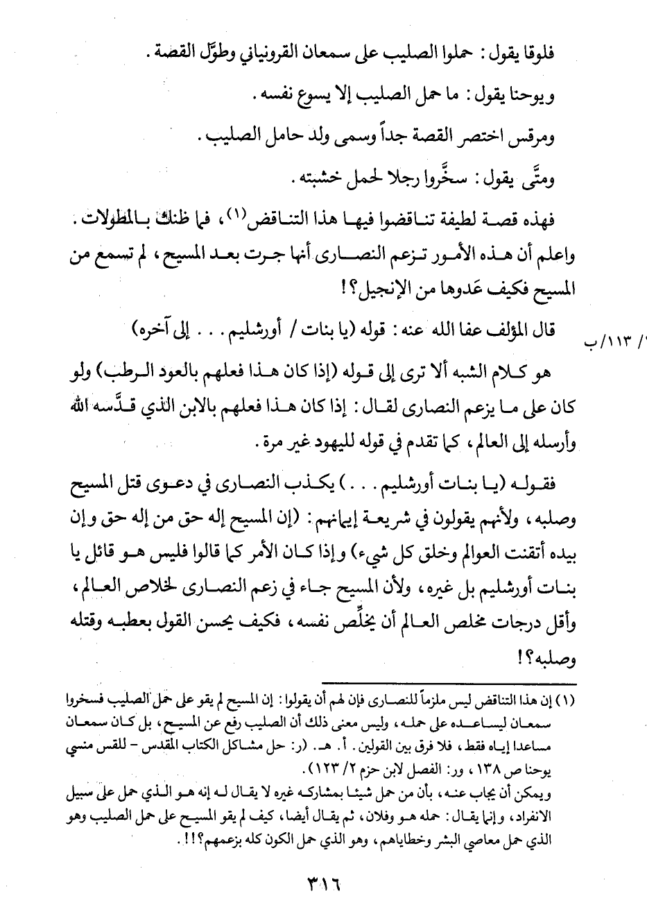 فقوله: (يا بنات أورشليم ... "، يكذب النصارى في دعوى قتل المسيح وصلبه، ولأنهم يقولون في شريعة إيمانهم: "إن المسيح إله حقّ من إله حقّ وإن بيده أتقنت العوالم وخلق كلّ شيء". وإذا كان الأمر كما قالوا فليس هو قائل: "يا بنات أورشليم"، بل غيره؛ ولأن المسيح جاء في زعم النصارى لخلاص العالم، وأقلّ درجات مخلص العالم أن يخلِّص نفسه، فكيف يحسن القول بعطبه وقتله وصلبه؟!.