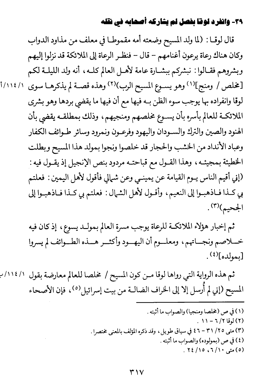 قال لوقا: "لما ولد المسيح وضعته أمّه مقموطاً في معلف من مذاود الدواب وكان هناك رعاة يرعون أغناهم - قال - فنظر الرعاة إلى الملائكة قد نزلوا إليهم وبشرهم فقالوا: نبشركم ببشارة عامة لأهل العالم كله، أنه ولد الليلة لكم [مخلّص/ (1/114/أ) ومنج] 1وهو يسوع المسيح الرّبّ"2. وهذه قصة لم يذكرها سوى لوقا وانفراده بها يوجب سوء الظن به فيها مع أن فيهاما يقضي بردهاوهو بشرى الملائكة للعالم بأسره بأن يسوع مخلّصهم ومنجيهم، وذلك بمطلقه يقضي بأن الهنود والصين والترك والسودان واليهود وفرعون ونمرود وسائر طوائف الكفار وعباد الأنداد من الخشب والحجار قد خلصوا ونجوا بمولد هذا المسيح وبطلت الخطيئة بمجيئه، وهذا القول مع قباحته مردود بنصّ الإنجيل إذ يقول فيه: "إني أقيم الناس يوم القيامة عن يميني وعن شمالي فأقول لأهل اليمين: فعلتم بيَ كذا فاذهبوا إلى النعيم، وأقول لأهل الشماء: فعلتم بيَ كذا فاذهبوا إلى الجحيم"3.