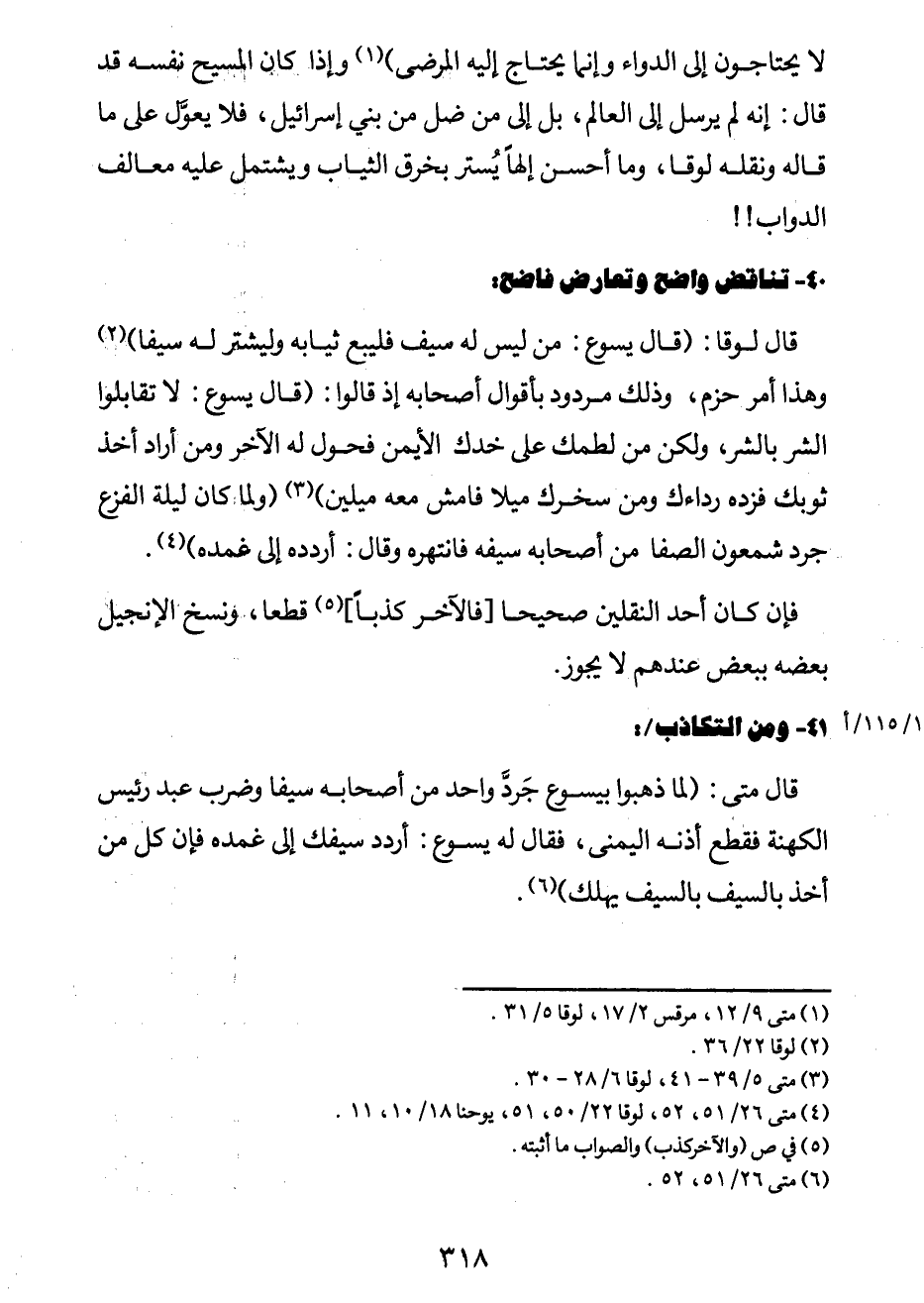 قال لوقا: "قال يسوع: من ليس له سيف فليبع ثيابه وليشتر له سيفاً"2. وهذا أمر حزم، وذلك مردود بأقوال أصحابه إذ قالوا: "قال يسوع: لا تقابلوا الشرّ بالشرّ، ولكن من لطمه على خدك الأيمن فحول له الآخر ومن أراد أخذ ثوبك فزده رادءك ومن سخرك ميلا فامش معه ميلين"3. "ولما كان ليلة الفزع جرد شمعون الصفا من أصحابه سيفه فانتهره وقال: أردده إلى غمده"4.