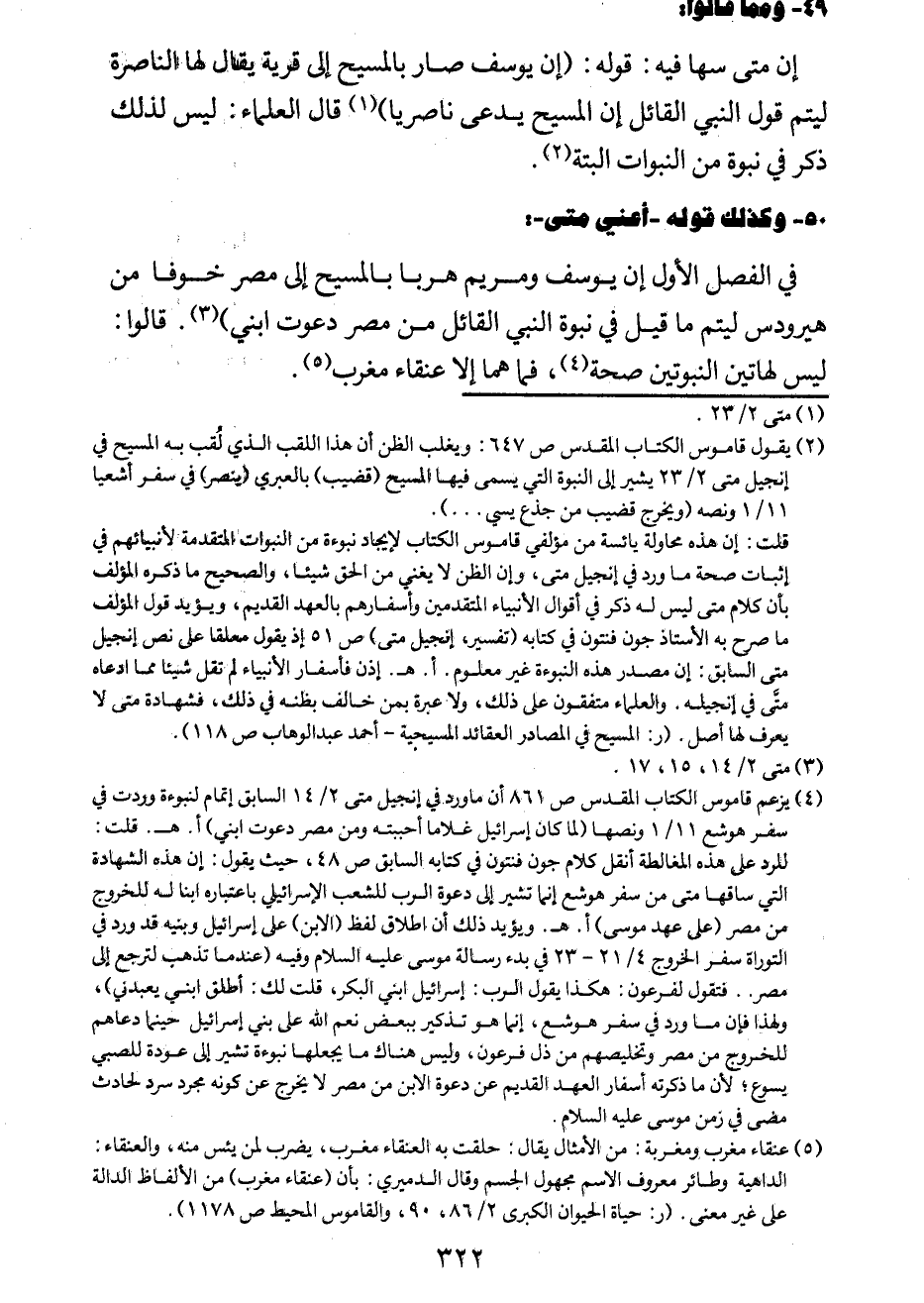 قلت: إن هذه محاولة يائسة من مؤلفي قاموس الكتاب لإيجاد نبوءة من النبوات المتقدمة لأنبيائهم في إثبات صحة ما ورد في إنجيل متى، وإن الظن لا يغني من الحقّ شيئاً، والصحيح ما ذكره المؤلِّف بأن كلام متى ليس له ذكر في أقوال الأنبياء المتقدمين وأسفارهم بالعهد القديم، ويؤيّد قول المؤلِّف ما صرح به الأستاذ جون فنتون في كتابه: (تفسير إنجيل متى ص 51) ، إذ يقول معلّقاً على نصّ إنجيل متى السابق: "إن مصدر هذه النبوءة غير معلوم" اهـ. إذن فأسفار الأنبياء لم تقل شيئاً مما ادّعاه متّى في إنجيله. والعلماء متّفقون على ذلك، ولا عبرة بمن خالف بظنه في لك، فشهادة متى لا يعرف لها أصل. (ر: المسيح في المصادر العقائد المسيحية - أحمد عبد الوهّاب ص 118) .