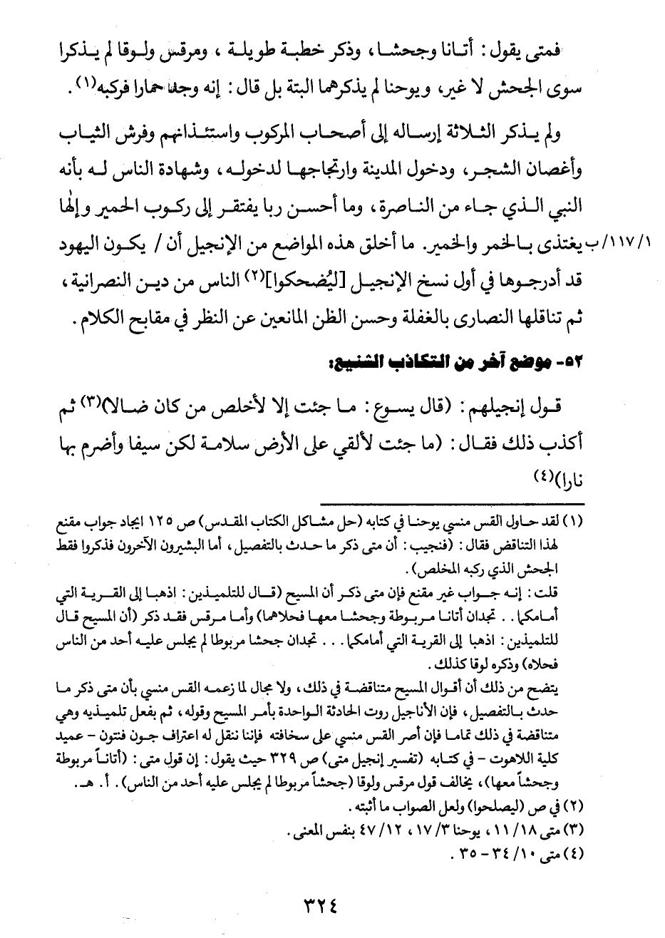 ولم يذكر الثلاثة إرساله إلى أصحاب المركوب واستئذانهم وفرش الثياب وأغصان الشجر، ودخول المدينة واتجاجها لدخوله، وشهادة الناس له، بأنه النبي الذي جاء من الناصرة، وما أحسن رباً يفتقر إلى ركوب الحمير وإلهاً يغتذى بالخمر والخمير. مأ أخلق هذه المواضع من الإنجيل أن / (1/117/ب) يكون اليهود قد أدرجها في أوّل نسخ الإنجيل [ليُضحكوا] 1 الناس من دين النصراينة، ثم تناقلها النصارى بالغفلة وحسن الظن المانعين عن النظر في مقابح الكلام.