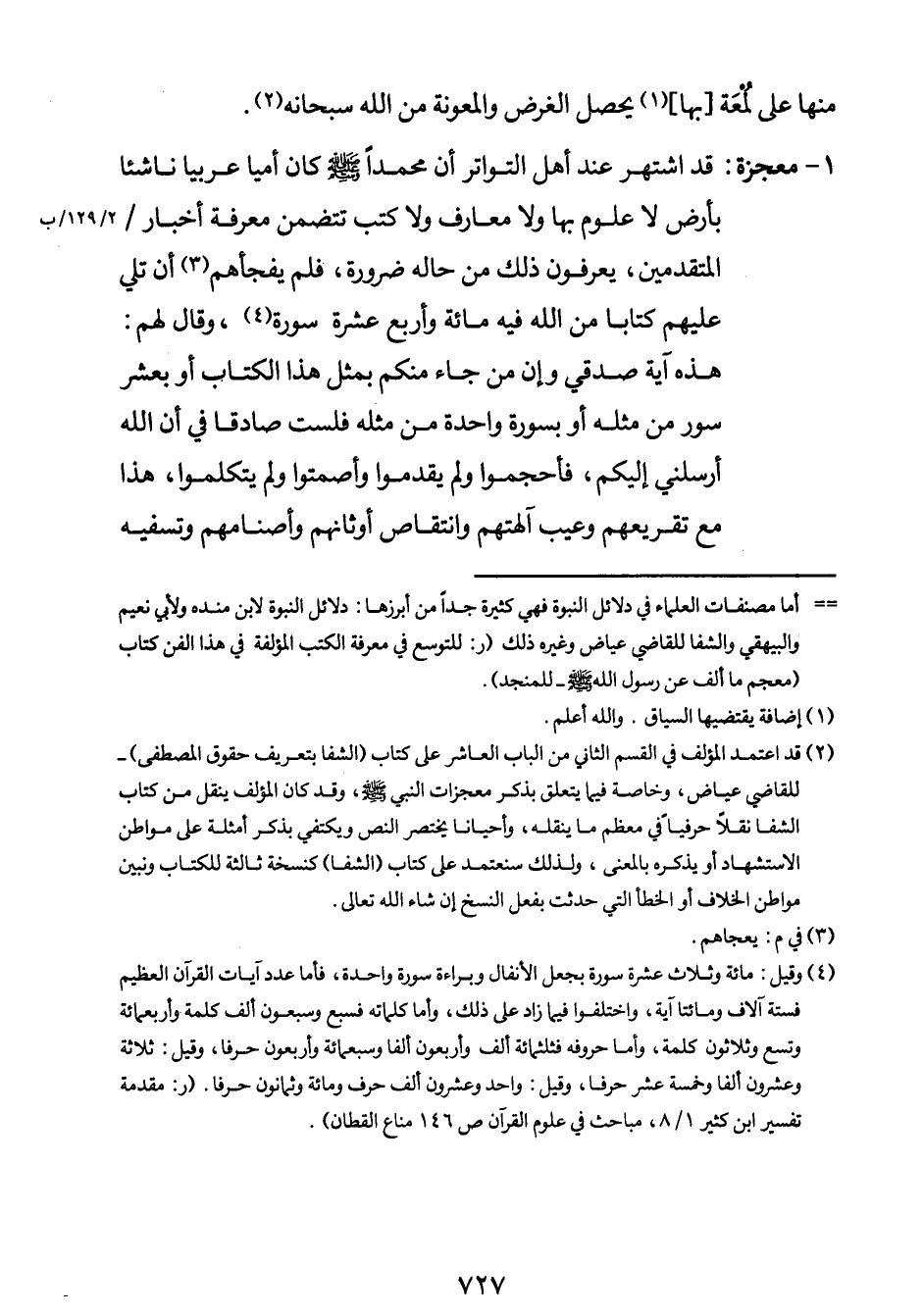 1- معجزة: قد اشتهر عند أهل التواتر أن محمّداً صلى الله عليه وسلم كان أمّيّاً عربيّاً ناشئاً بأرض لا علوم بها ولا معارف ولا كتب تتضمن معرفة أخبار / (2/129/ب) المتقدمين يعرفون ذلك من حاله ضرورة. فلم يفجأهم3 أن تلي عليهم كتاباً من الله فيه مائة وأربع عشر سورة4. وقال لهم: هذه آية صدقي وإن مَن جاء منكم بمثل هذا الكتاب أو بعشر سور من مثله أو بسورة واحدة من مثله فلست صادقاً في أن الله أرسلني إليكم. فأجمعوا ولم يقدموا وأصمتوا ولم يتكلموا. هذا مع تقريعهم وعيب آلهتهم وانتقاص أوثانهم وأصنامهم وتسفيه