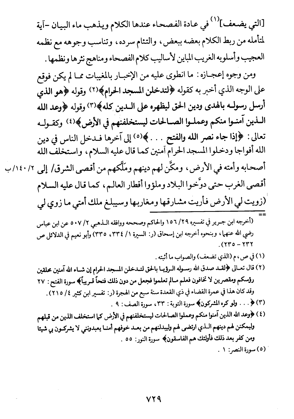 ومن وجوه إعجازه: ما انطوى عليه من الإخبار بالمغيّبات مما لم يكن فوقع على الوجه الذي أخبر به كقوله: {لَتَدْخُلُنَّ المَسْجِدَ الحَرَامَ} 2. وقوله: {هُوَ الَّذِي أَرْسَلَ رَسُولَهُ بِالهُدَى وَدِينِ الحَقِّ لِيُظْهِرَهُ عَلَى الدِّينِ كُلِّهِ} 3. وقوله: {وَعَدَ الله الَّذِينَ آمَنُوا مِنْكُم وَعَمِلُوا الصَّالِحَاتِ لَيَسْتَخْلِفَنَّهُم فِي الأَرْضِ} 4. وكقوله تعالى: {إِذَا جَاءَ نَصْرُ الله وَالفَتْحُ ... } . [سورة النصر، الآية: 1] . إلى آخرها. فدخل الناس في دين الله أفواجاً ودخلوا المسجد الحرام آمنين كما قال عليه السلام، واستخلف الله أصحابه وأمته في الأرض. ومكَّن لهم دينهم وملَّكهم من أقصى الشرق / (2/140/ب) إلى أقصى الغرب حتى دوَّخوا البلاد وملؤوا أقطار العالم. كما قال عليه السلام: "زويت لي الأرض فأريت مشارقها ومغاربها. وسيبلغ ملك أمتي ما زوي لي