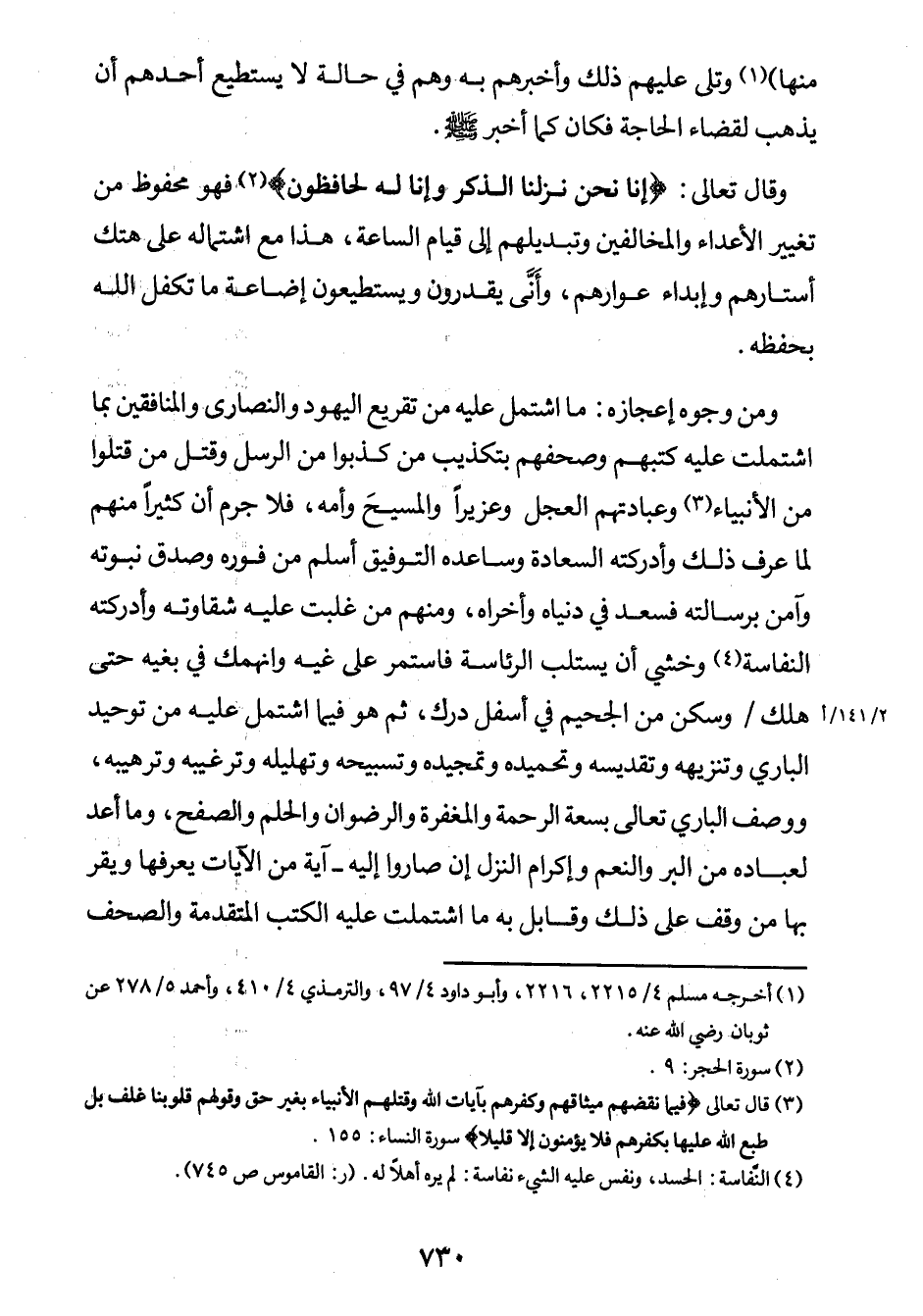 وقال تعالى: {إِنَّا نَحْنُ نَزَّلْنَا الذِّكْرَ وَإِنَّا لَهُ لَحَافِظُونَ} . [سورة الحجر، الآية:9] . فهو محفوظ من تغيير الأعداء والمخالفين وتبديلهم إلى قيام الساعة. هذا مع اشتماله على هتك أستارهم وإبداء عوارهم. وأنَّى يقدرون ويستطيعون إضاعة ما تكفل الله بحفظه!.