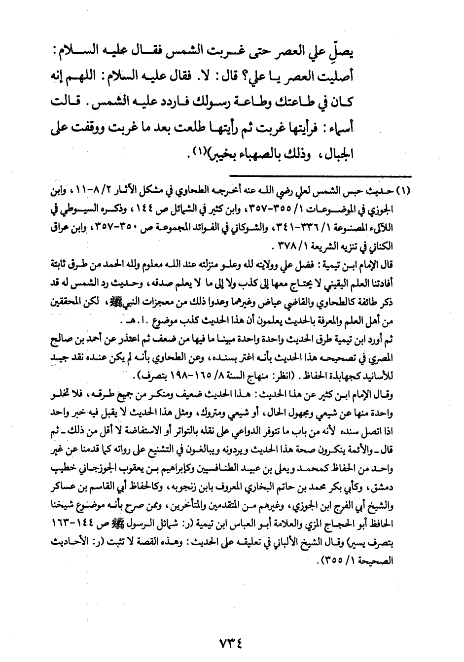 1 حديث حبس الشمس لعليّ رضي الله عنه أخرجه الطحاوي في مشكل الآثار 2/8-11، وابن الجوزي في الموضوعات 1/355-357، وابن كثير في الشمائل ص 144، وذكره السيوطي في اللآلئ المصنوعة 1/336-341، والشوكاني في الفوائد المجموعة ص 350-357، وابن عراق الكناني في تنْزيه الشريعة 1/378.