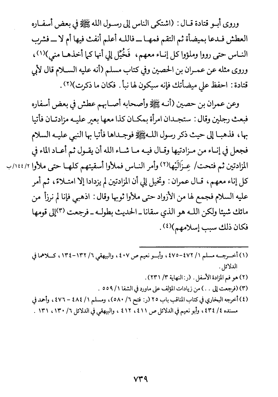 وعن عمران بن حصين: "أنه صلى الله عليه وسلم وأصحابه أصابهم عطش في بعض أسفاره فبعث رجلين، وقال: ستجدان امرأة بمكان كذا معها بعير عليه مزادتان فأتيا بها، فذهبا إلى حيث ذكر رسول الله صلى الله عليه وسلم فوجداها أتيا بها النبي عليه السلام فجعل في إناء من مزادتيها. وقال فيه ما شاء الله أن يقول، ثم أعاد الماء في المزادتين ثم فتحت / (2/144/ب) عِزَالَيْها3 وأمر الناس فملأوا أسقيتهم كلّها حتى ملأوا كلّ إناء معهم. قال عمران: وتخيل إلي أن المزادتين لم يزدادا إلاّ امتلاءً. ثم أمر عليه السلام فجمع لها من الأزواد حتى ملأوا ثوبها وقال: اذهبي فإنا لم نرزأ من مائك شيئاً ولكن الله هو الذي سقانا" - الحديث بطوله - فرجعت4 إلى قومها فكان ذلك سبب إسلامهم"5.