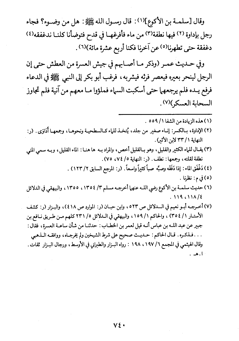 وقال سلمة بن الأكوع] 1: قال رسول الله صلى الله عليه وسلم: "هل من وضوء؟ ". فجاء رجل بإداوة2 فيها نطفة3 من ماء فأفرغها في قدح فتوضأنا كلّنا ندغفقه4 دغفقة حتى تطهرنا5 عن آخر فكنا أربع عشرة مائة"6.