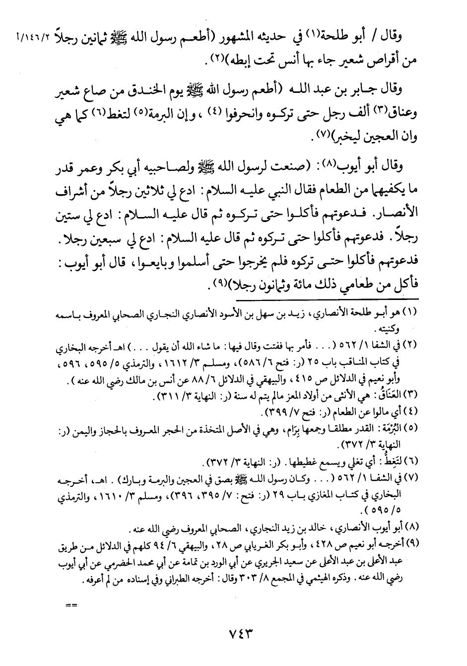 7 في الشفا 1/562، " ... وكان رسول الله صلى الله عليه بصق في العجين والبرمة وبارك". اهـ. أخرجه البخاري في كتاب المغازي باب (29) . (ر: فتح الباري 7/395، 396) ، ومسلم 3/1610، والترمذي 5/595) .