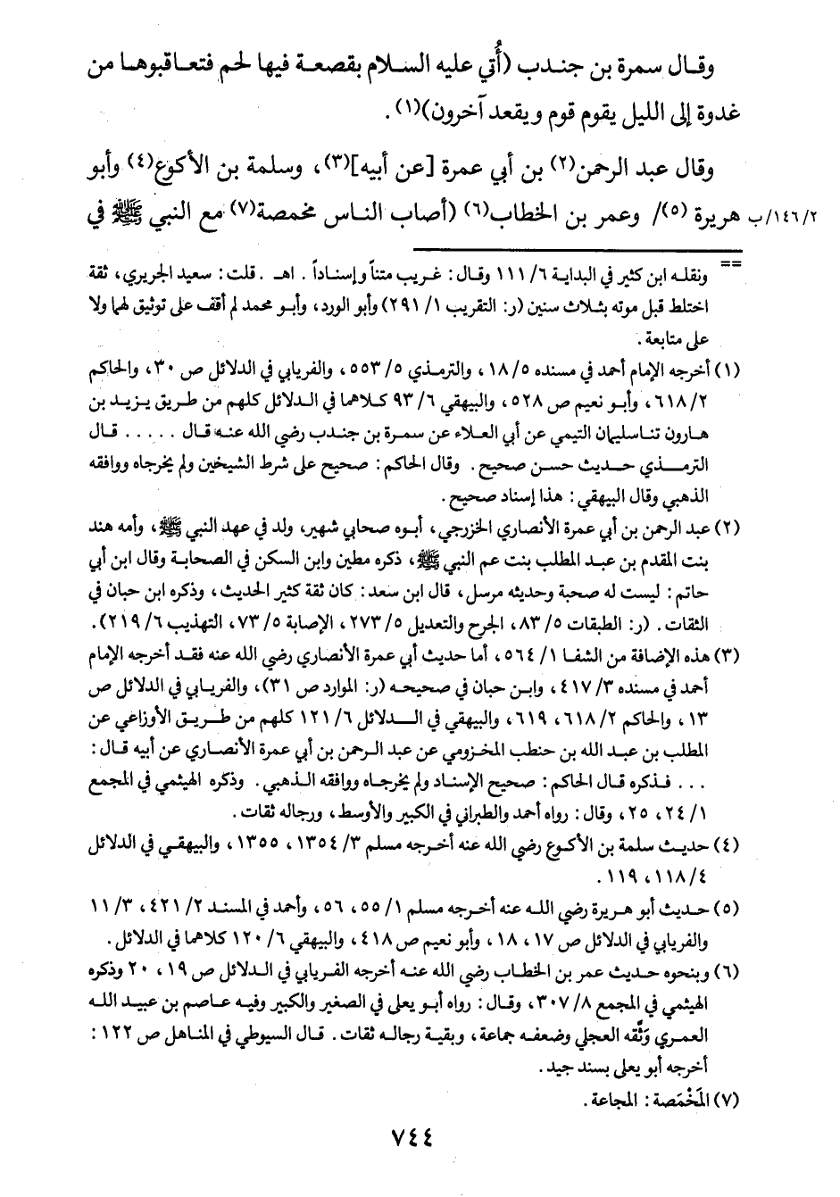 1 أخرجه الإمام أحمد في مسنده 5/18، والترمذي 5/553، والفريابي في الدلائل ص 30، والحاكم 2/618، وأبو نعيم ص 528، والبيهقي 6/93، كلاهما في الدلائل، كلهم من طريق يزيد بن هارون تنا سليمان التيمي عن أبي العلاء سمرة بن جندب رضي الله عنه، قال: ... ،قال الترمذي: "حديث حسن صحيح".وقال الحاكم: "صحيح على شرط الشيخين ولم يخرجاه". ووافقه الذهبي. وقال البيهقي: "هذا إسناد صحيح".