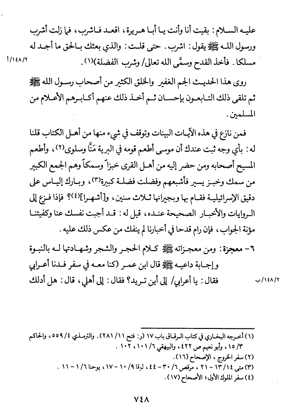 6- معجزة: ومن معجزاته صلى الله عليه وسلم كلام الحجر والشجر وشهادتها له بالنبوة وإجابة داعيه صلى الله عليه وسلم. قال ابن عمر: "كنا معه في سفر فدنا أعرابي فقال: يا أعرابي / (2/148/ب) إلى أين تريد؟ فقال: إلى أهلي. قال: هل أدلك