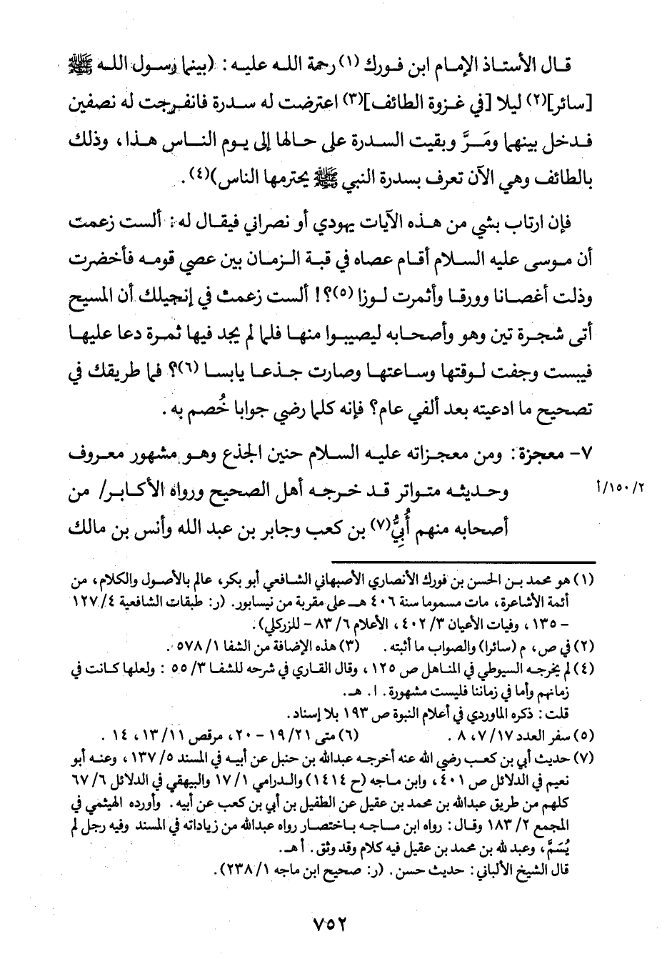 قال الأستاذ الإمام ابن1 فورك - رحمة الله عليه -: "بينما رسول الله صلى الله عليه وسلم [سائر] 2 ليلاً [في غزوة الطائف] 3 اعترضت له سدرة فانفرجت له نصفين فدخل بينهما ومَرَّ وبقيت السدرة على حالها إلى يوم الناس هذا، وذلك بالطائف وهي الآن تعرف بسدرة النبي صلى الله عليه وسلم يحترمها الناس"4.