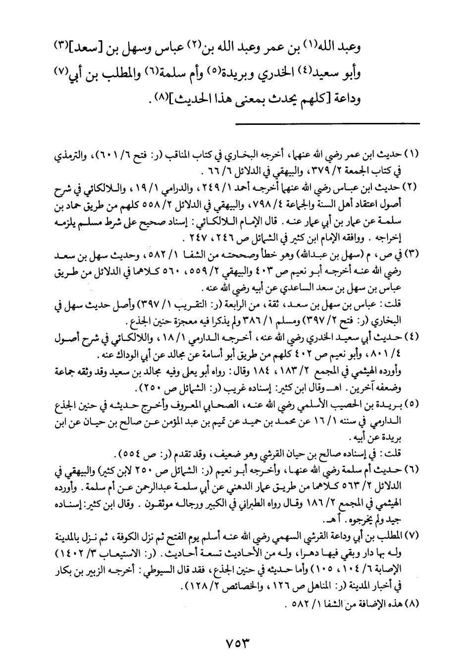 1 حديث ابن عمر رضي الله تعالى عنهما أخرجه البخاري في كتاب المناقب. (ر: فتح الباري6/601) ، والترمذي في كتاب الجمعة2/379، والبيهقي في الدلائل6/66.