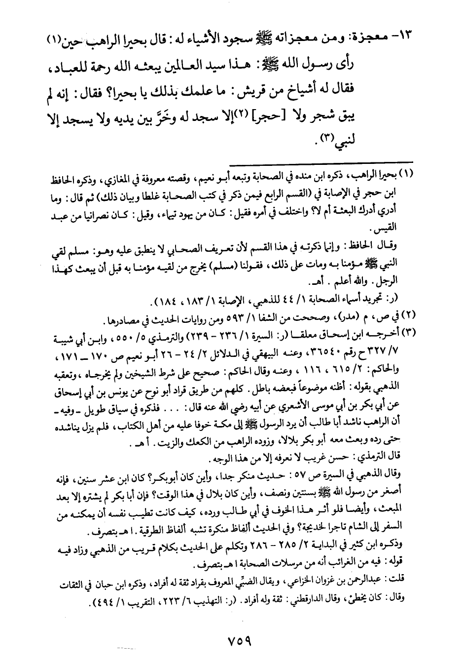 13- معجزة: ومن معجزاته صلى الله عليه وسلم سجود الأشياء له. قال بحيرا1 الراهب حين رأى رسول الله صلى الله عليه وسلم: "هذا سيّد العالمين يبعثه الله رحمةً للعباد، فقال له أشياخ من قريش: ما علمك بذلك يا بحيرا؟ فقال: إنه لم يبق شجر ولا [حجر] 2 إلاّ سجد له وَخَرَّ بين يديه ولا يسجد إلاّ لنبيّ"3.