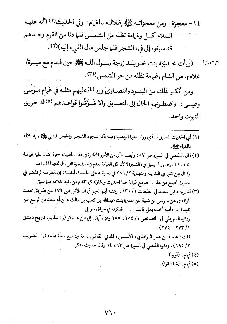 2 قال الذهبي في السيرة ص 57: "أي: من الأمور المنكرة في هذا الحديث - فإذا كان عليه غمامة تظله، كيف يتصور أن يميل فيء الشجرة؟ لأن ظل الغمامة يعدم فيء الشجرة التي نزل تحتها؟!!! " اهـ.