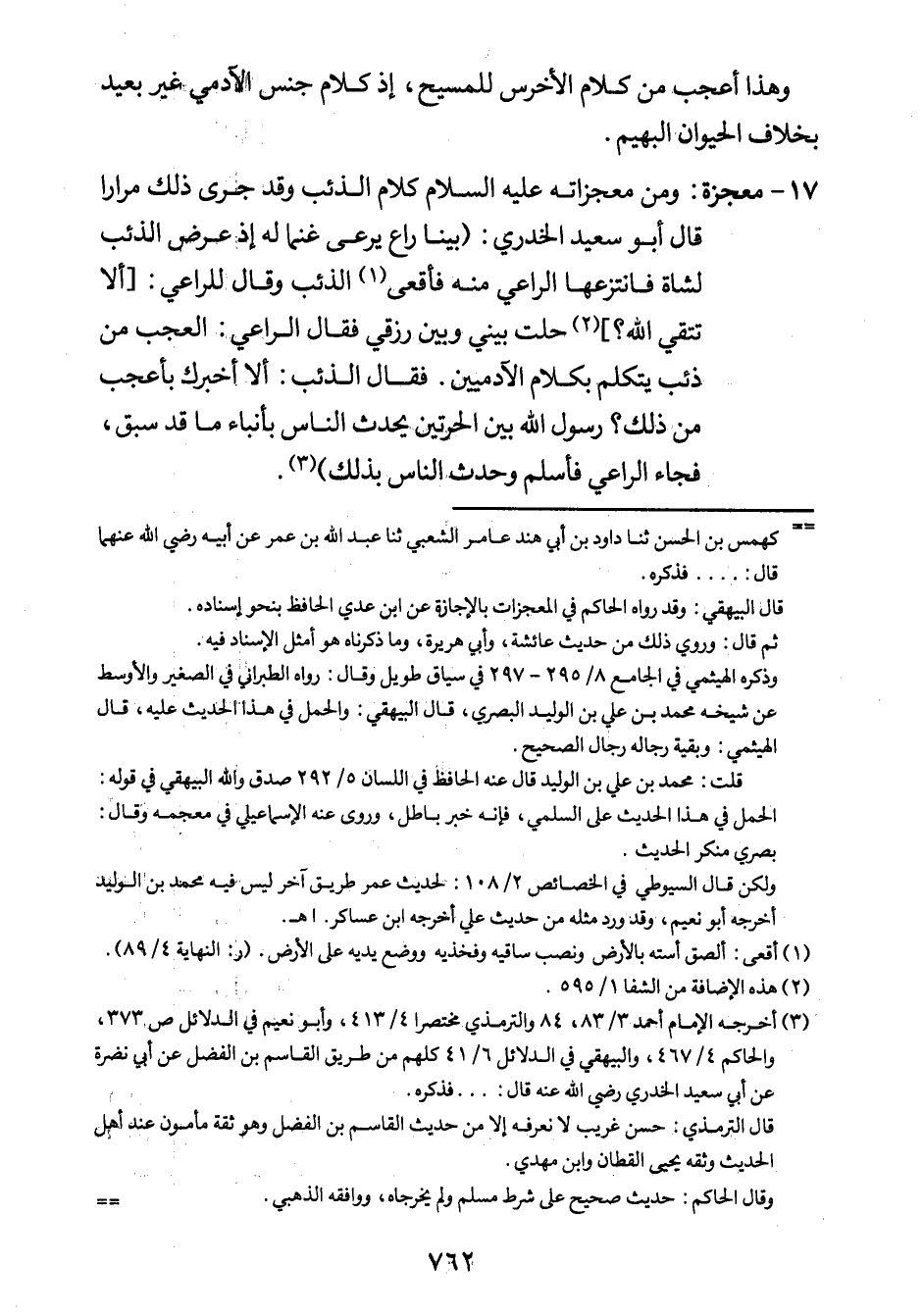 17- معجزة: ومن معجزاته عليه السلام كلام الذئب. وقد جرى ذلك مراراً. قال أبو سعيد الخدري: "بينا راعٍ يرعى غنماً له إذ عرض له الذئب لشاة فانتزعها الراعي منه فأقعى1 الذئب، وقال للراعي: [ألا تتقي الله؟] 2 حلت بيني وبين رزقي. فقال الراعي: العجب من ذئب يتكلم بكلام الآدميّين. فقال الذئب: ألا أخبرك بأعجب من ذلك؟ رسول الله بين الحرتين يحدّث الناس بأنباء ما قد سبق، فجاء الراعي فأسلم وحدّث الناس بذلك"3.