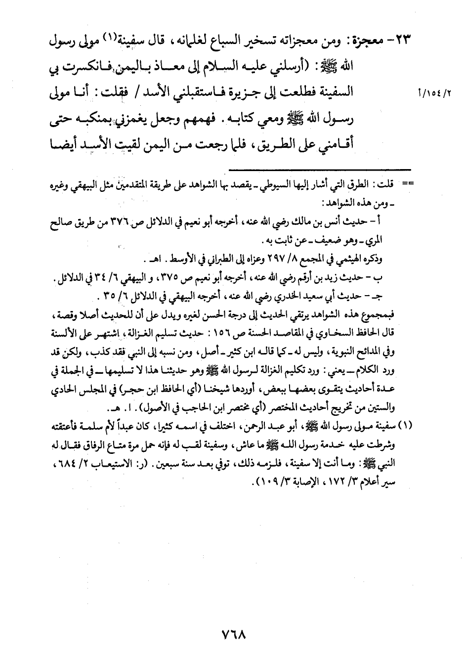 23- معجزة: ومن معجزاته تسخير السباع لغلمانه، قال سفينه1 مولى رسول الله صلى الله عليه وسلم: "أرسلني عليه السلام إلى معاذ باليمن فانكسرت بيَ السفينة فطلعت إلى جزيرة فاستقبلني الأسد / (2/154/أ) فقلت: أنا مولى رسول الله صلى الله عليه وسلم ومعي كتابه. فهمهم وجعل يغمزني بمنكبه حتى أقامني على الطريق. فلما رجعت من اليمن لقيت الأسد أيضاً