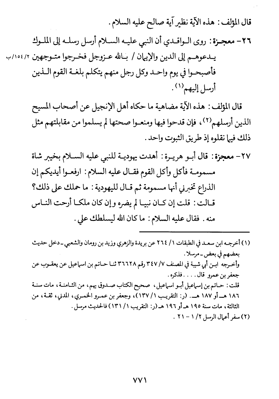 26- معجزة: روى الواقدي أن النبيّ عليه السلام أرسل رسله إلى الملوك يدعوهم إلى الدين والإيمان / (2/154/ب) بالله عزوجل فخرجوا متوجهين فأصبحوا في يوم واحد وكلّ رجل منهم يتكلم بلغة القوم الذين أرسل إليهم1.