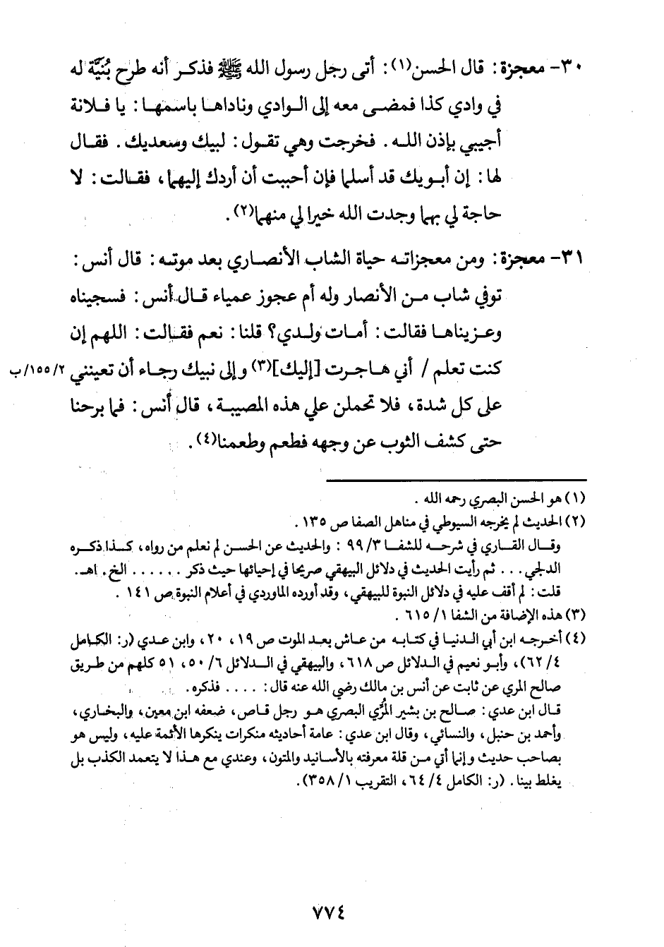 30- معجزة: قال الحسن1: "أتى رجل رسول الله صلى الله عليه وسلم فذكر أنه طرح بُنَيَّة له في وادي كذا، فمضى معه إلى الوادي وناداها باسمها: يا فلانة أجيْبِي بإذن الله. فخرجت وهي تقول: لبيك وسعديك. فقال لها: إن أبويك قد أسلما فإن أحببت أن أردك إليهما، فقالت: لا حاجة لي بهما وجدت الله خيراً لي منهما"2.