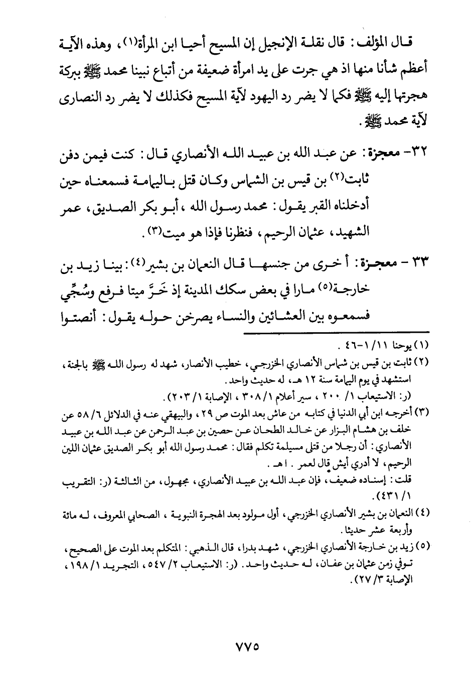 32- معجزة: عن عبد الله بن عبيد الله الأنصاري، قال: كنت فيمن دفن ثابت2 بن قيس بن الشماس وكان قتل باليمامة فسمعناه حين أدخلناه القبر يقول: محمّد رسول الله، أبو بكر الصّدِّيق، عمر الشهيد، عثمان الرحيم، فنظرنا فإذا هو ميّت"3.