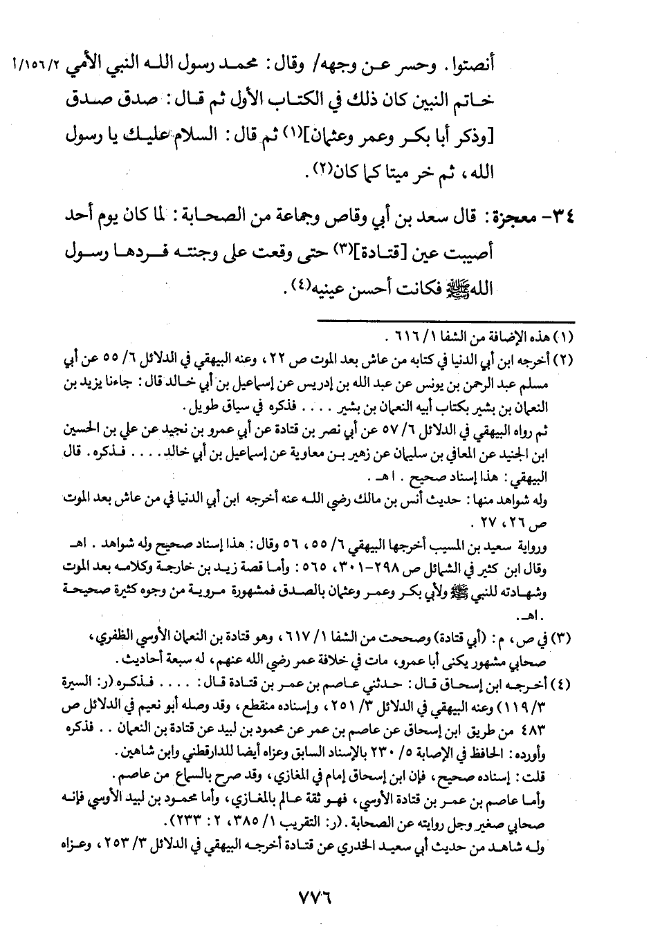 34- معجزة: قال سعد بن أبي وقاص وجماعة من الصحابة: لما كان يوم أحد أصيبت عين [قتادة] 3 حتى وقعت على وجنته فردّها رسول الله صلى الله عليه وسلم فكانت أحسن عينيه4.
