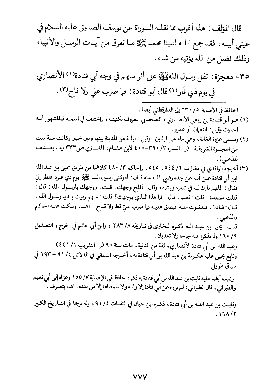 35- معجزة: نقل رسول الله صلى الله عليه وسلم على أثر سهم في وجه أبي1 قتادة الأنصاري في يوم ذي قَار2، قال أبو قتادة: فما ضرب عليّ ولا قاح3.